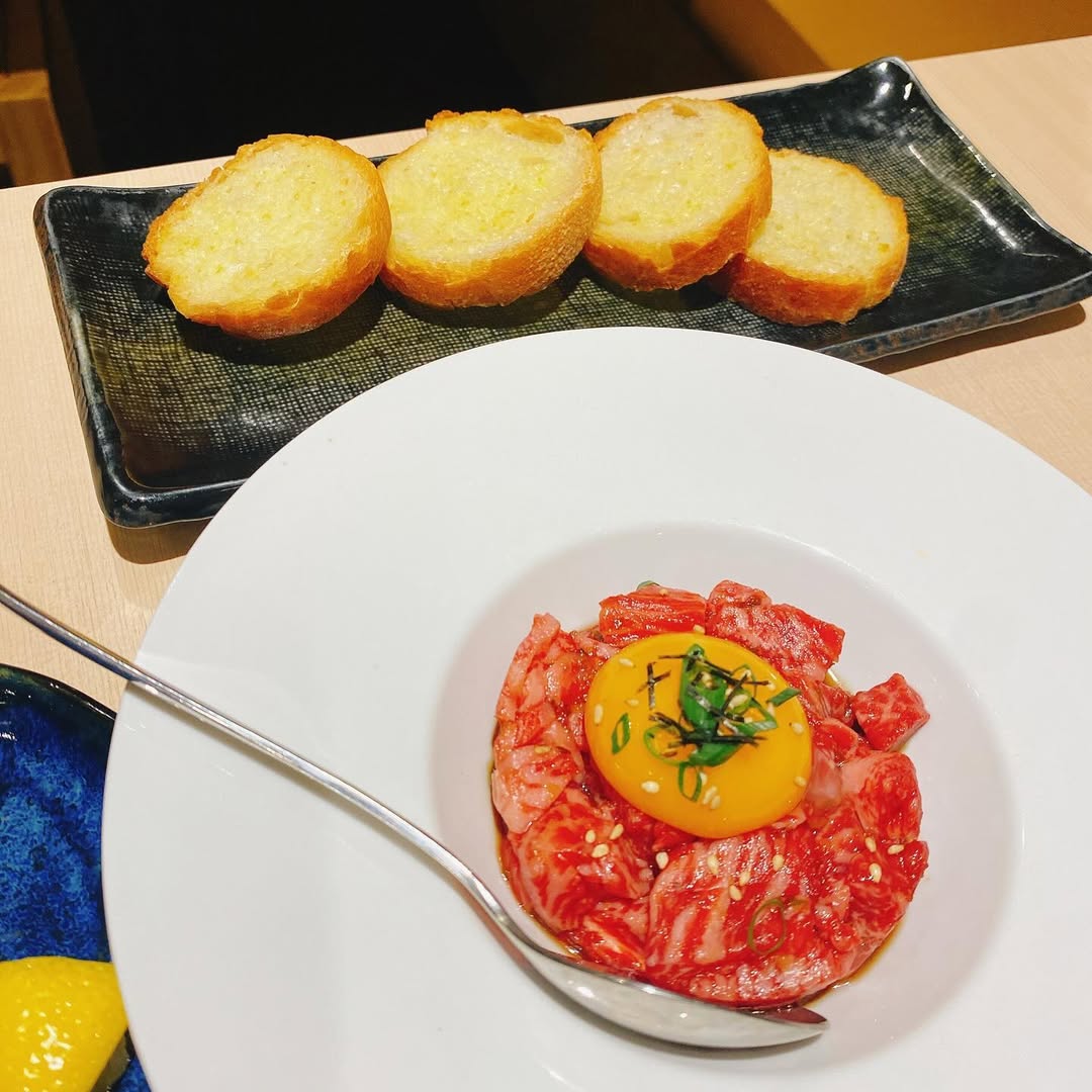 鉄板で焼いたバゲットの上にとろとろのユッケを乗せて食べます。およそメニュー表の飾り気のない「ブルスケッタ」という名前からは誰も想像がつかないメニューでしょう。少し焦がしたオイルのしみたバゲットとタレのユッケのジューシーさ、意外だけどベストマッチな組み合わせです。