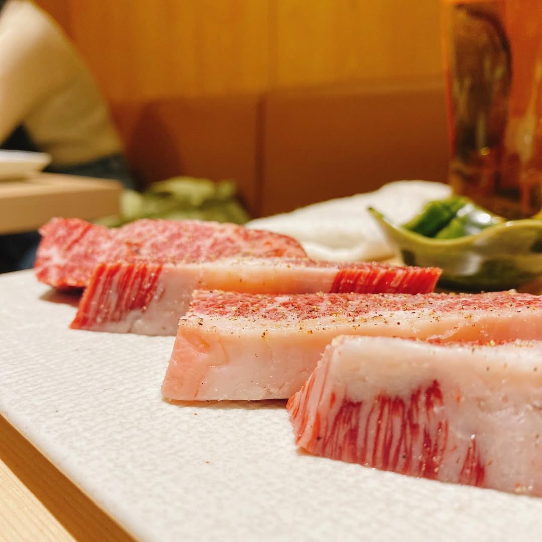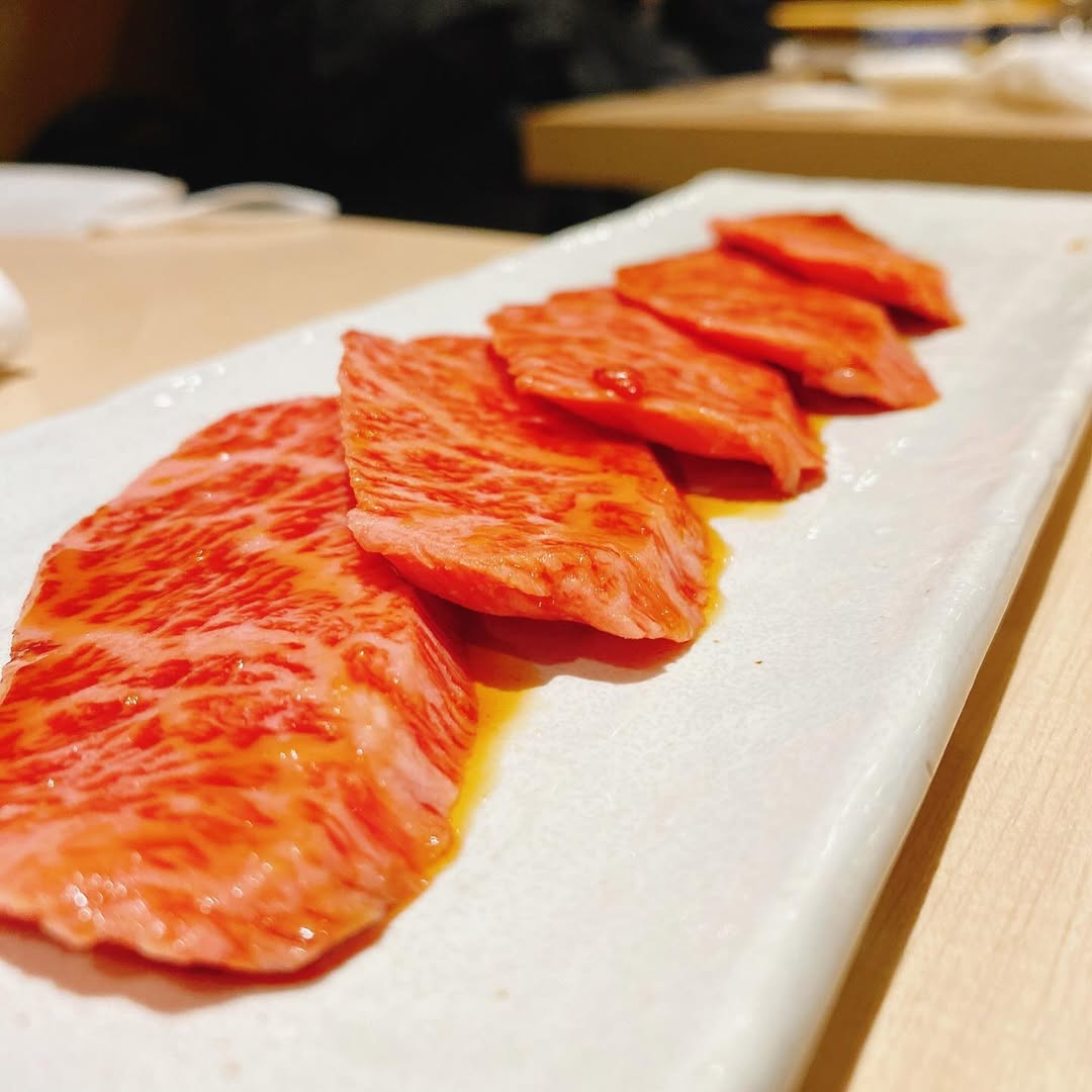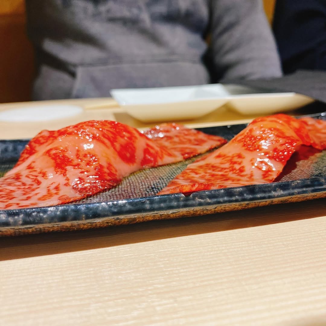 サーロインの炙り握りからスタートして、ワインを飲みながら焼肉の到着を待ちます。とても気に入ったのはハラミ。薄切りと厚切りが選べて、厚切りの方が値は張りますが、こちらもとても柔らかくて歯切れが良く、おそらくはハラミを厚めで美味しく食べられるように選び抜かれたものなのでしょう。焼肉はその他タン、カルビや上カルビ、石焼ビビンバなどを注文しましたが、ハラミの次に良かったのはシマチョウですね。