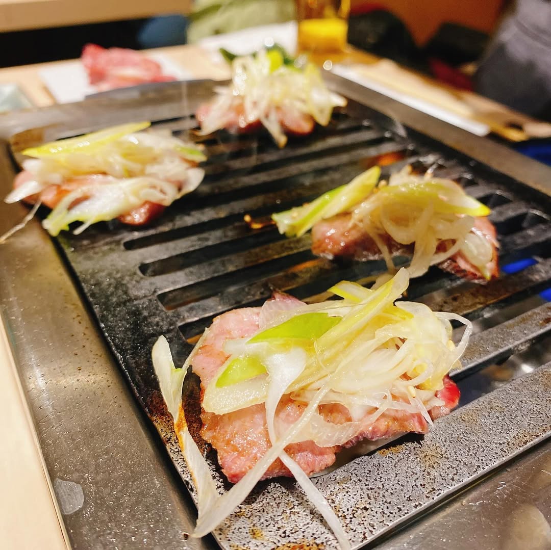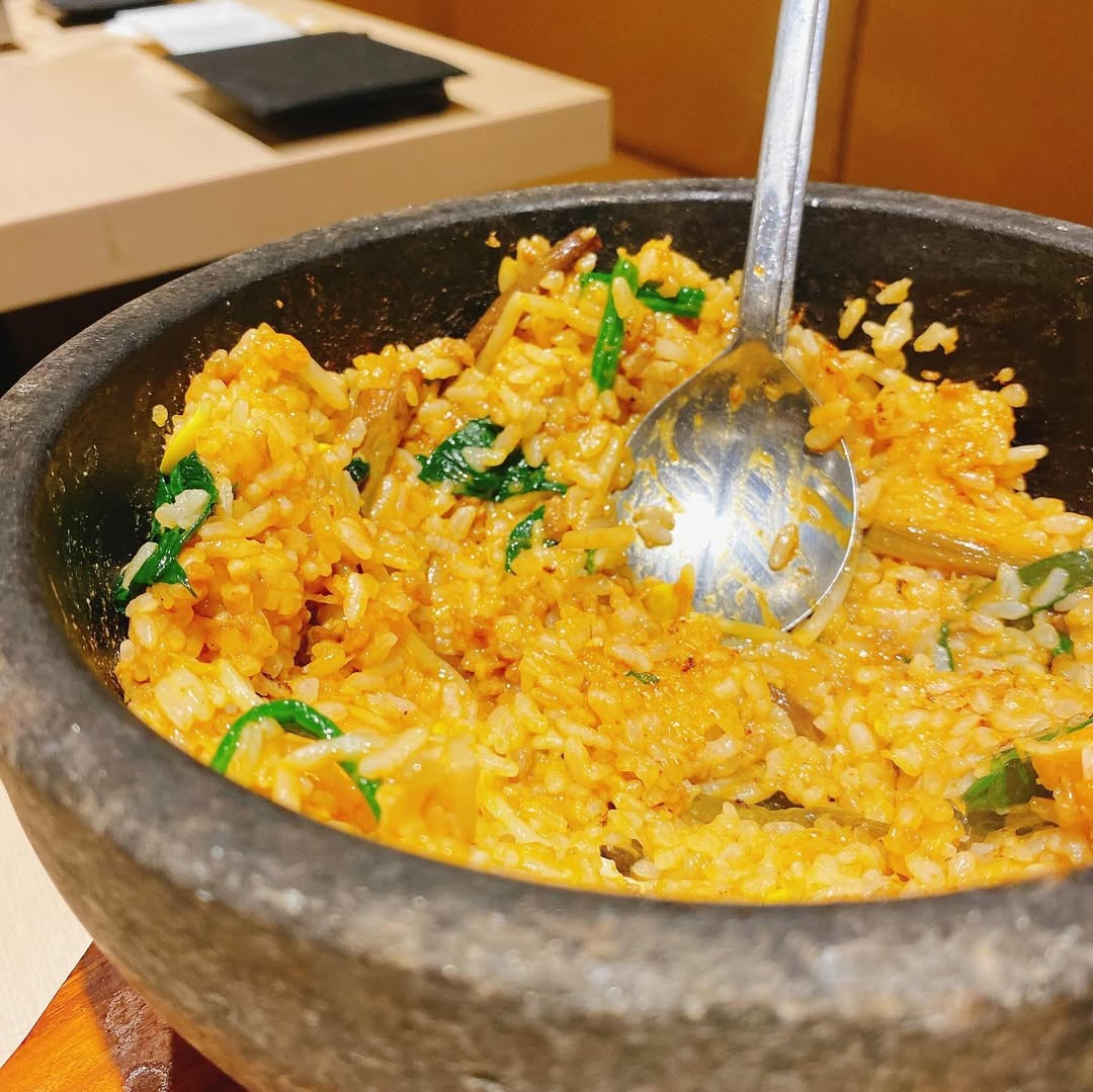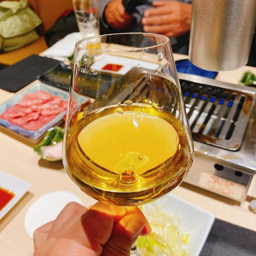 サーロインの炙り握りからスタートして、ワインを飲みながら焼肉の到着を待ちます。とても気に入ったのはハラミ。薄切りと厚切りが選べて、厚切りの方が値は張りますが、こちらもとても柔らかくて歯切れが良く、おそらくはハラミを厚めで美味しく食べられるように選び抜かれたものなのでしょう。焼肉はその他タン、カルビや上カルビ、石焼ビビンバなどを注文しましたが、ハラミの次に良かったのはシマチョウですね。