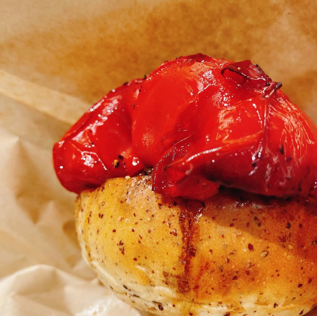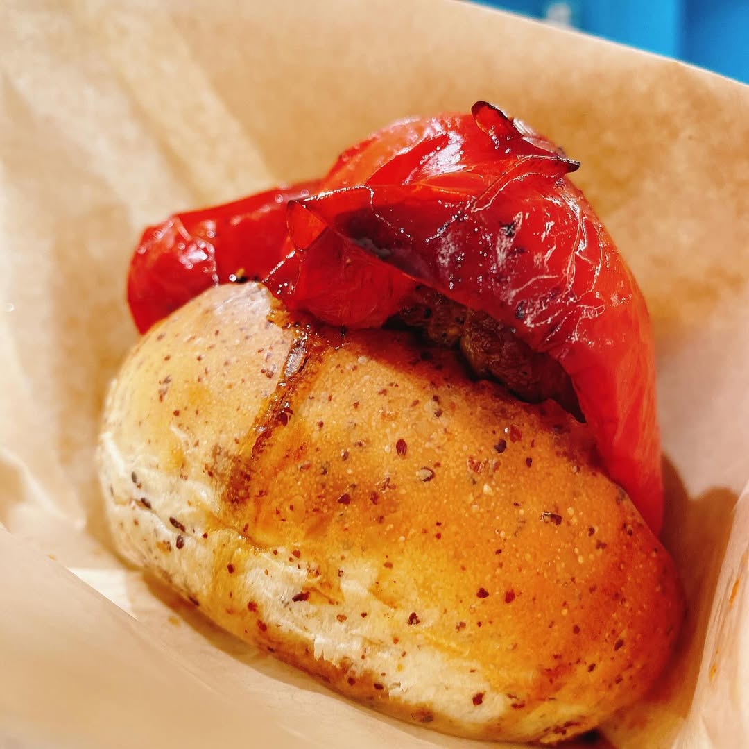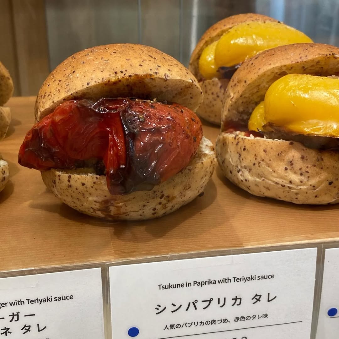 横浜では有名らしいパン屋、つばめパンの香ばしい胚芽パンのバンズに、浅草橋の焼き鳥屋、鳥茂のタレを使った同店のメニューでもあるパプリカの肉詰めを挟んでいます。