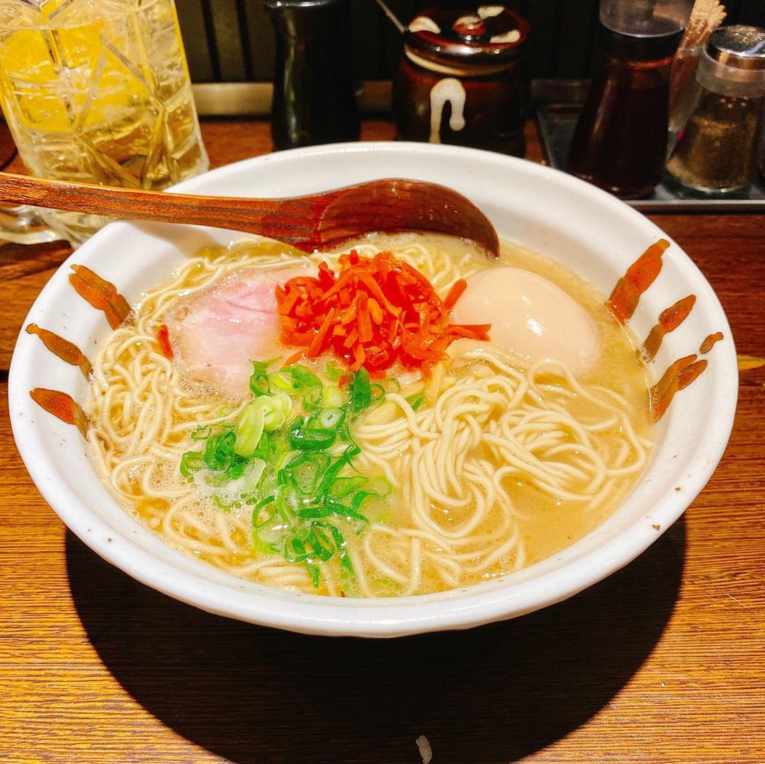 通常の具はネギとチャーシュー1枚、紅生姜は乗せ放題です。このお店のスープは他のものもかなりとろっとしていて濃いスープですが、博多ラーメン系のスープもとろとろでご飯ともビールやハイボールとも合います。