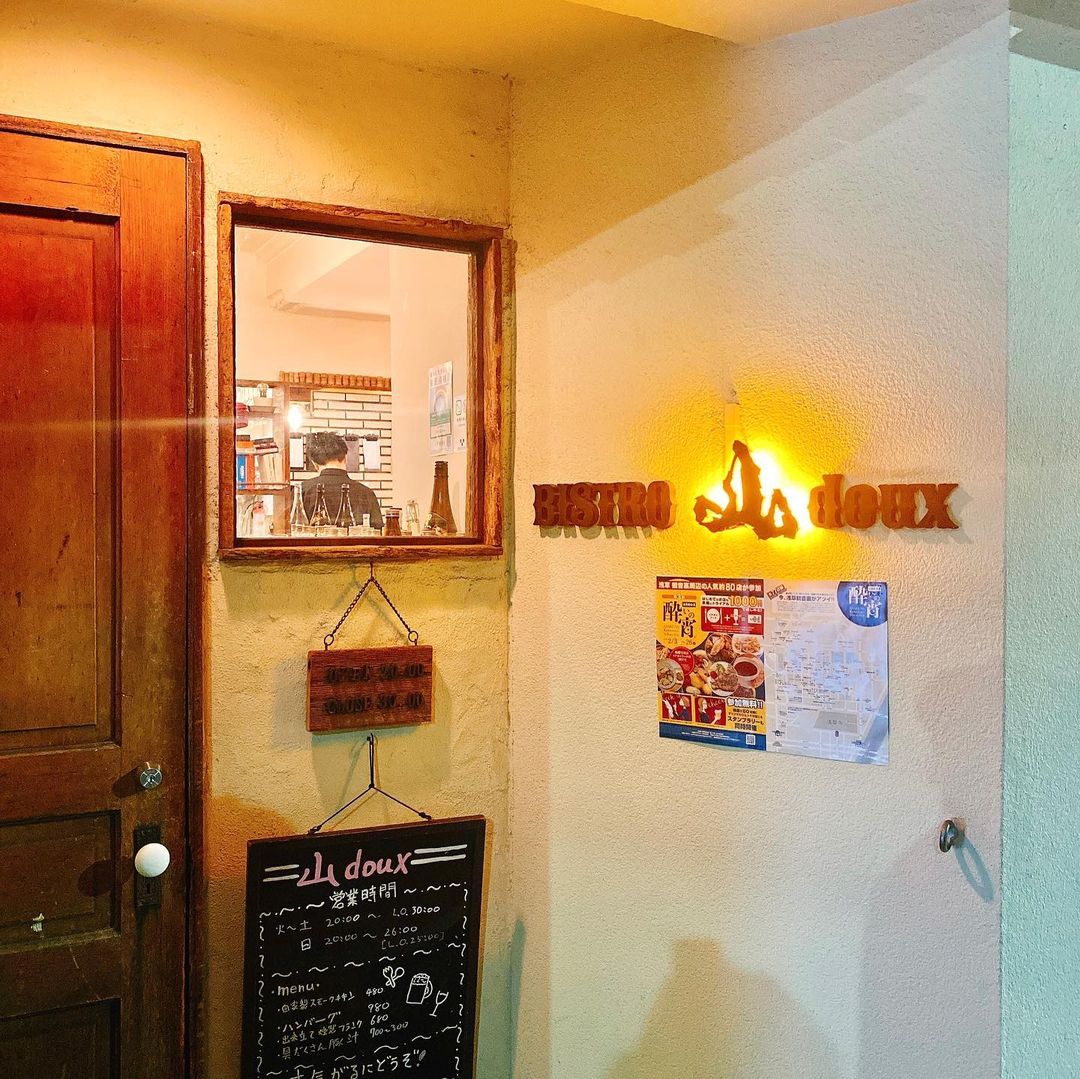 Bistro 山 Douxは深夜、ほぼ朝まで営業しているビストロ&バー。パテやキャロットラペなどの前菜の他、自家製ソーセージや子羊のロティなど肉料理をメインとしているようです。カレーやローストビーフなどもあります。