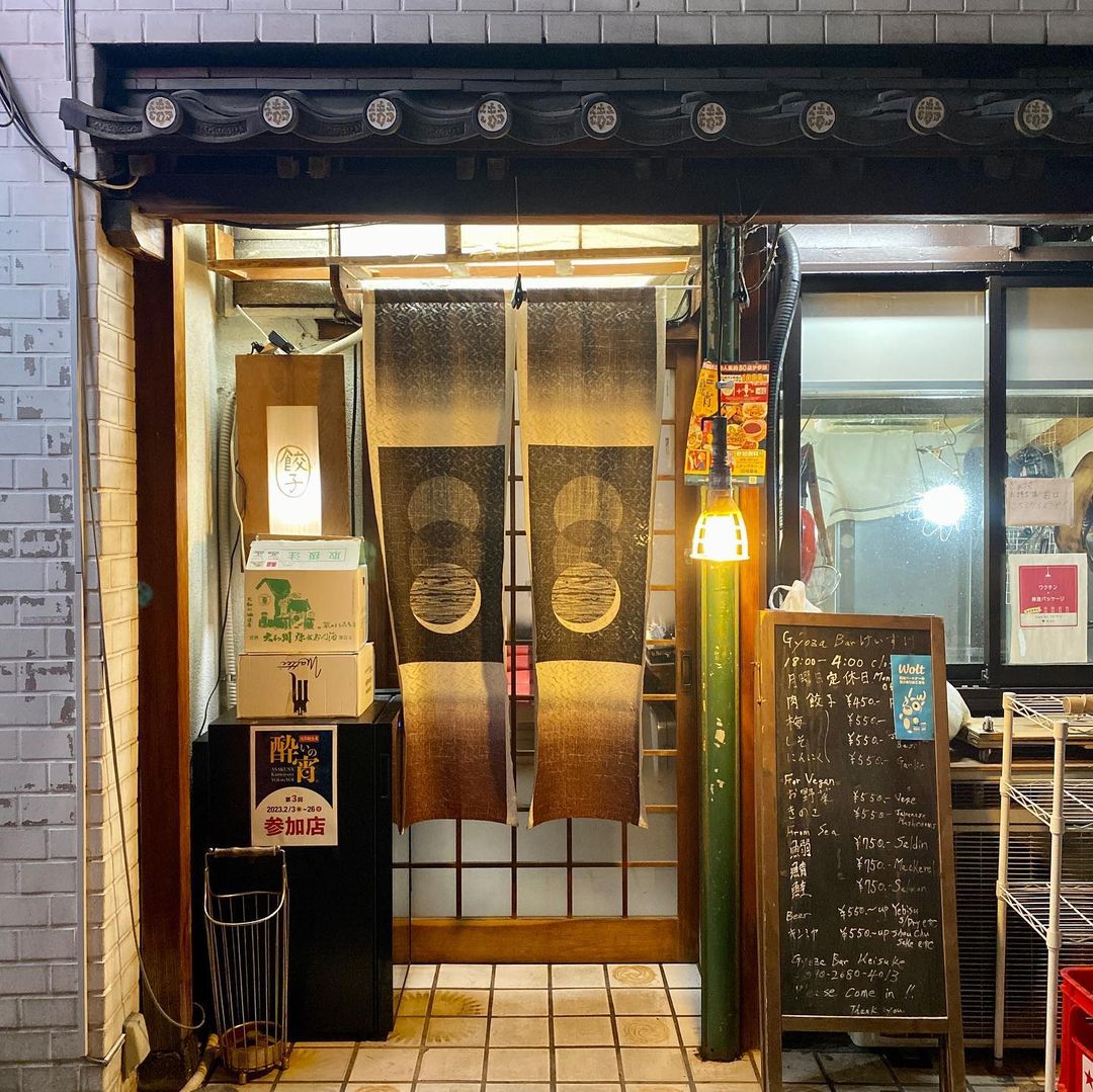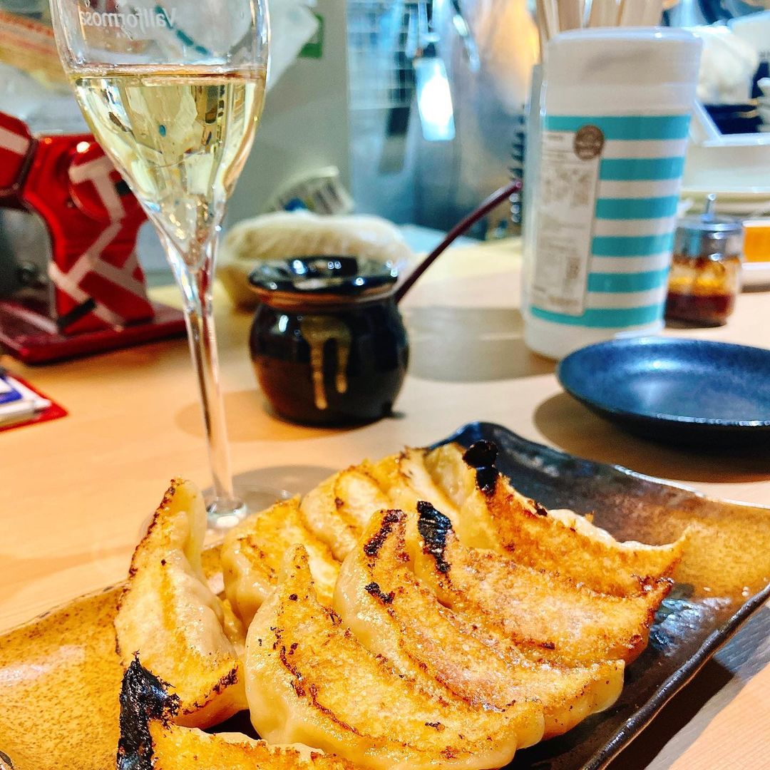 3軒目はGyoza Barけいすけ。以前からよく話を聞いていてとても気になっていました。ここではスパークリングワインと餃子5つ。和風な外観からとはギャップのあるモダンな雰囲気のセットですね。ワインはカヴァ レコダ ブリュット。餃子は通常のタレとは別にアップルビネガーや中国酢が選べます。また、オススメは味噌タレとのことでした。
