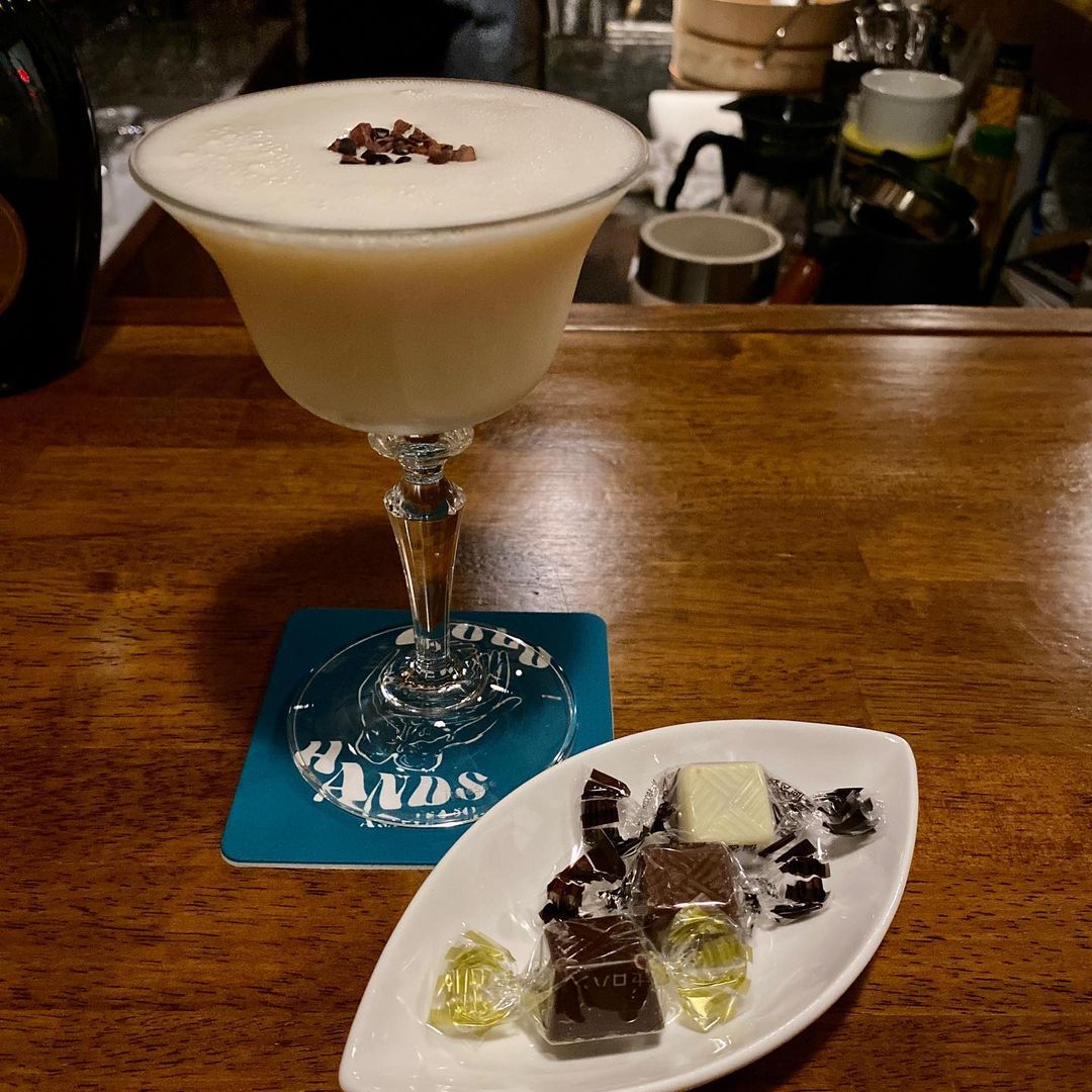 付き合ってもらった2人と解散し、最後はバー、Cold Handsへ。ここでは数種のカクテルにチョコかナッツを合わせる形のせんトラセットです。胡桃のアレキサンダーとチョコを選びました。アレキサンダーのナッティな香りとチョコレートがとてもとても相性が良く、胡桃を使ったアレキサンダーのアレンジが効いています。カカオニブを乗せてあるのがまたいいですね。