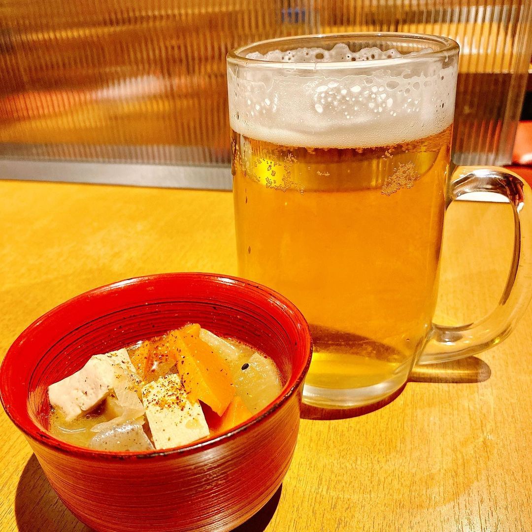 まずスタートはひさご通りの家庭料理Takeya。ここでいただいたのは豚汁とパリッと皮ネギ。豚汁は通常メニューにはなく、お通し枠のようです。せんトラセットの飲み物は通常の飲み放題メニューのドリンクから1つ、という形で今回はビールを選択。