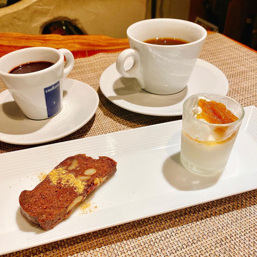デザートははっさくのコンフィチュールとクリームチーズジェラート、カシューナッツ入りショコラテリーヌ。こちらはコーヒーと合わせましたが、チーズジェラートと白ワインを合わせても良かったです。バレンタインメニューのホットチョコレートもいただきました。