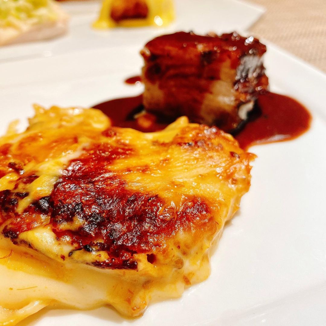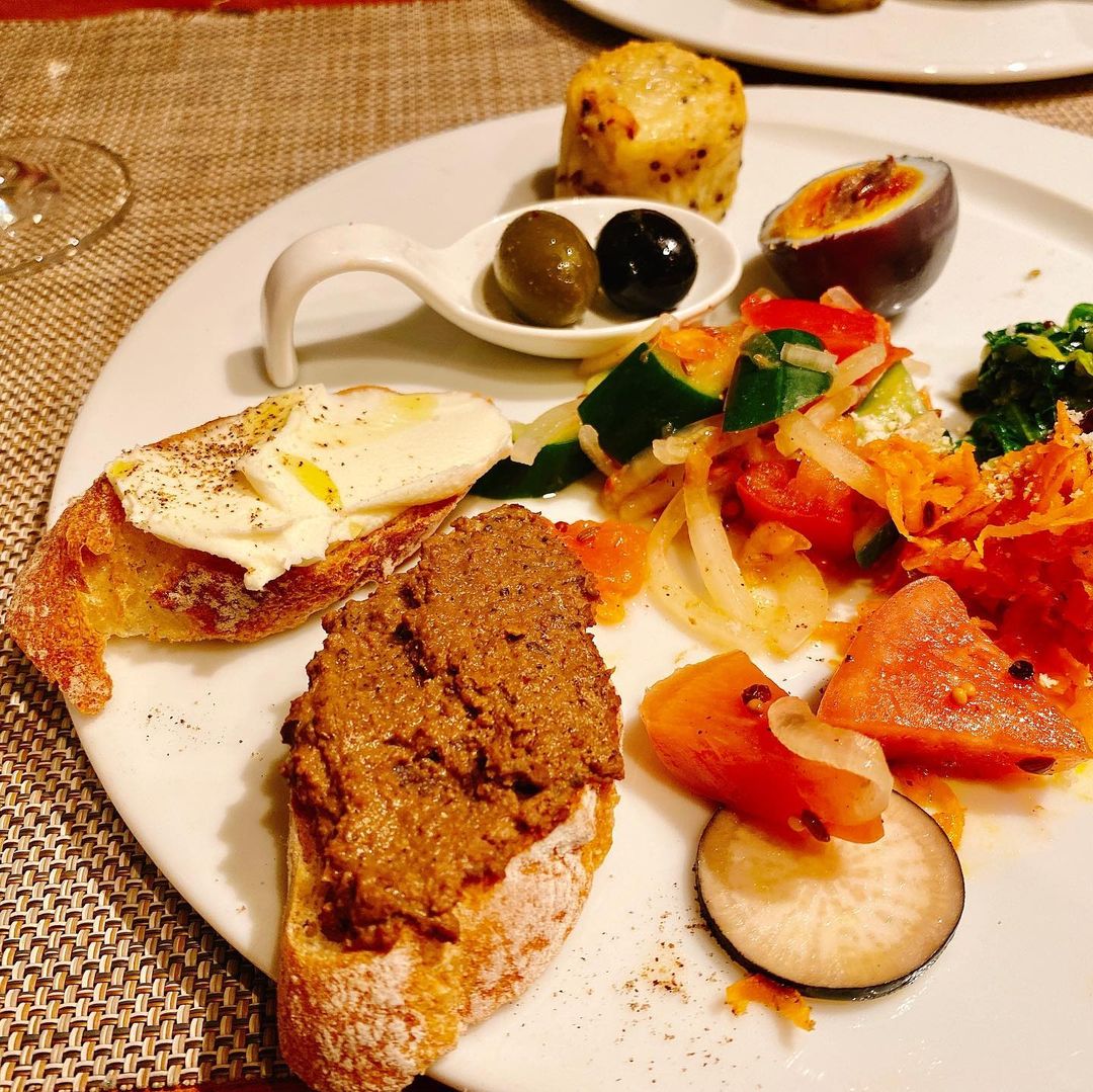 コースは9品もの前菜盛りから始まります。鶏レバーのクロスティーニやオリーブ、キャロットラペなどはスタンダードですが、粒マスタードを練り込んだじゃがいものスパイスポムカッセ、小松菜のサブジなど、カレーの付け合わせのようなラインナップ。このお店はトラットリアですが、普段ランチでカレー営業をしていたりするように、イタリアンとしては異色です。今回のメニューもパスタなどのイタリアンっぽいメニューがないのもあってかなり多国籍なプレートですね。