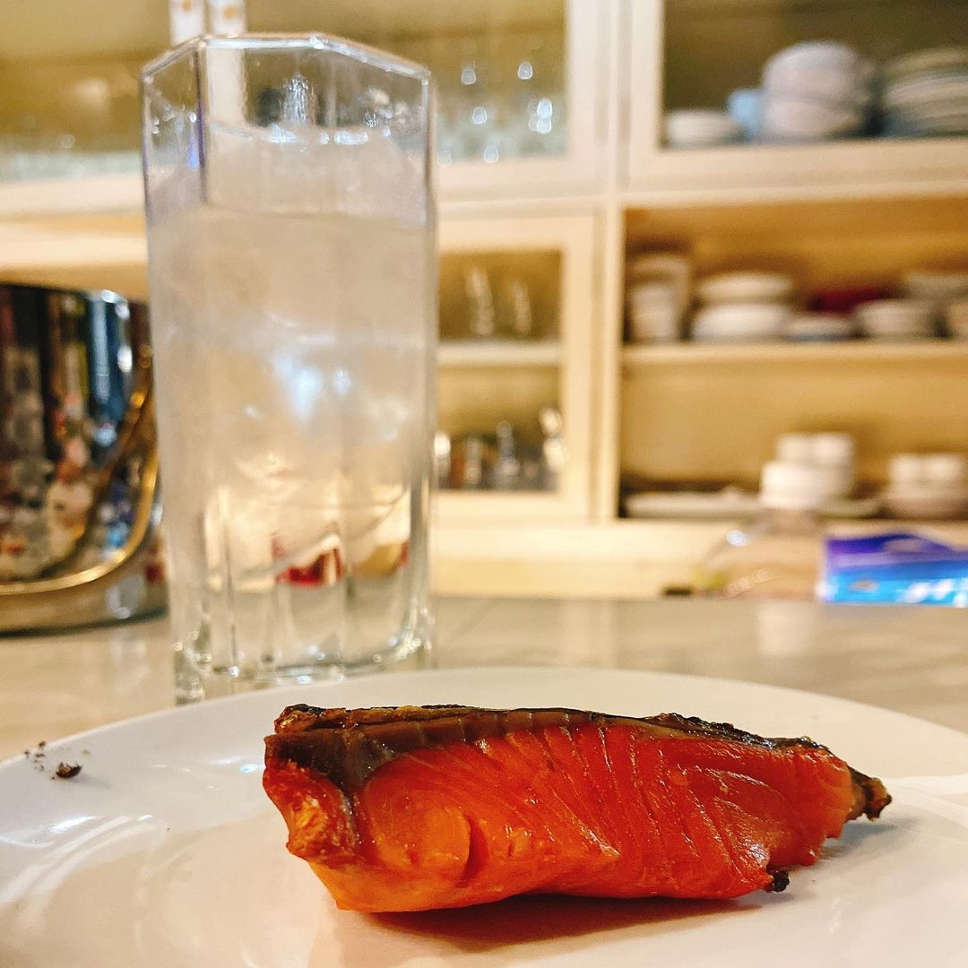 一緒に飲んでいた皆さんと解散し、観音裏に戻ってきて1人でうまずき食堂へ。シメとして黒霧島のソーダ割りと、鮭をいただきました。