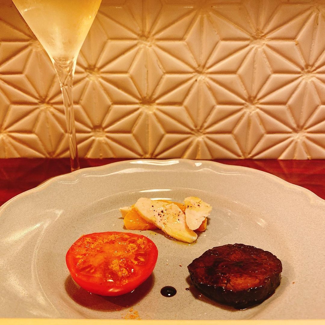 di Yamanda、イタリアンの店にやってきました。観音裏はフレンチが多く、イタリアンが意外なほどに少ないです。おつまみはトマトとからすみパウダー、オレンジと鳥のササミ(だったと思います)、茄子のバルサミコグリルの3種にスパークリングワイン、デオスティウミス グランキュヴェ ブリュット スプマンテをいただきました。
