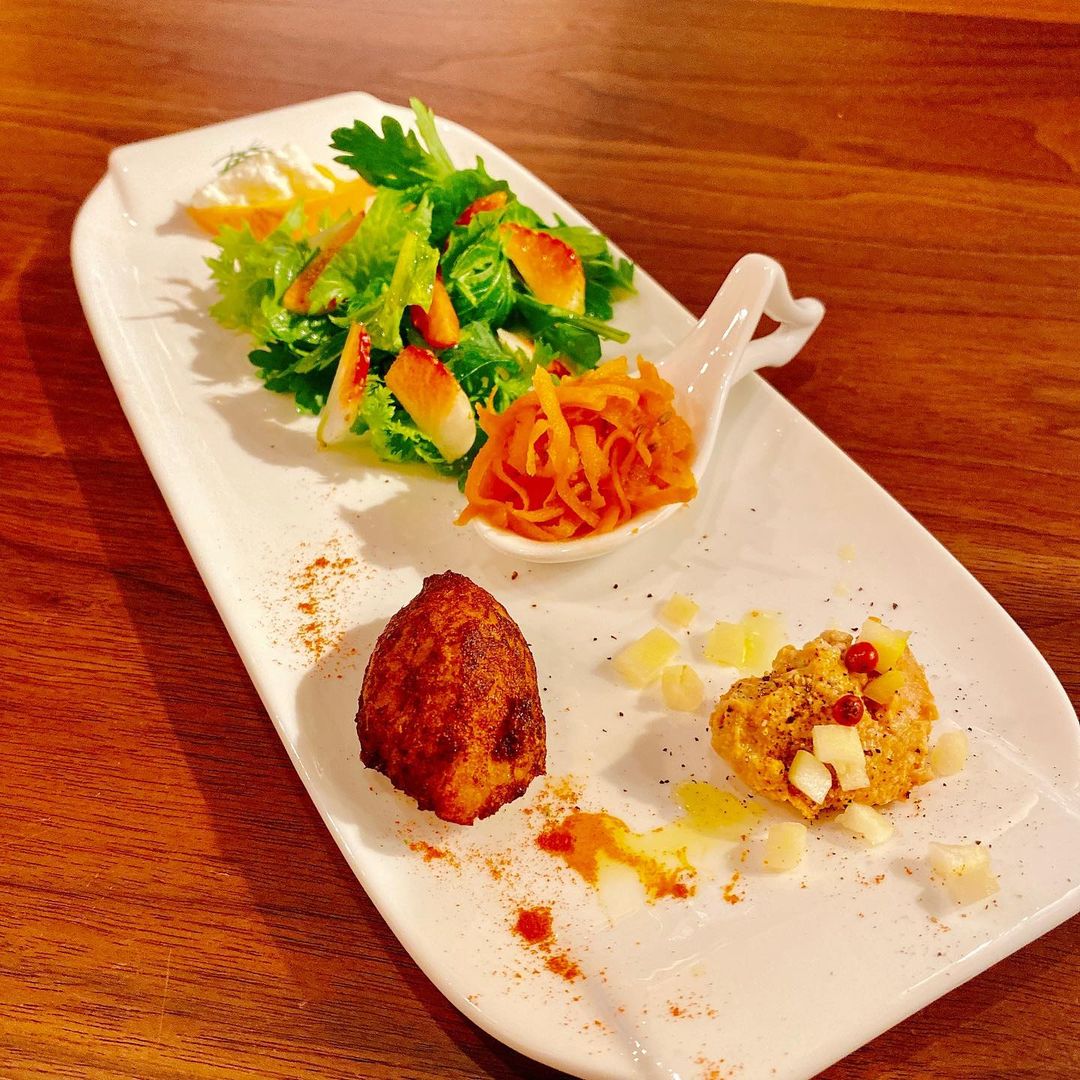 ポルトガル食房 ジーロ。メニューはひと皿で提供される料理としてはイベント中最も品数の多いおつまみの盛り合わせ。バカラオのコロッケ、イチゴのサラダ、フレッシュチーズとはるみ(オレンジ)、キャロットラペ、アンコウのテリーヌ。アンコウはとても濃厚でお気に入りです。酒は以前も飲んだポルトガルのワイン、ヴィア・ラティーナ ヴィーニョ・ヴェルデ。