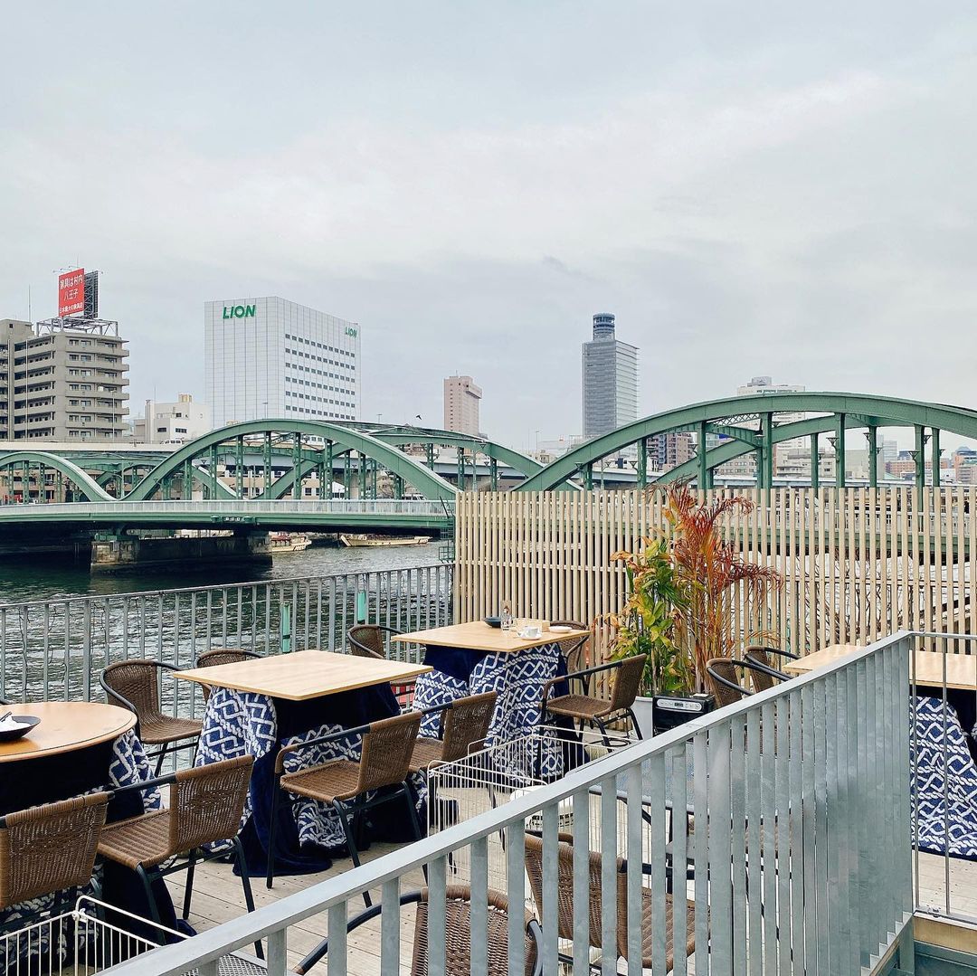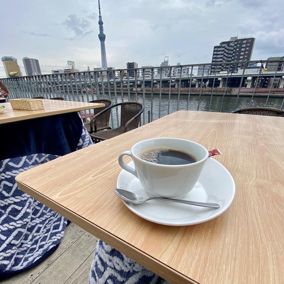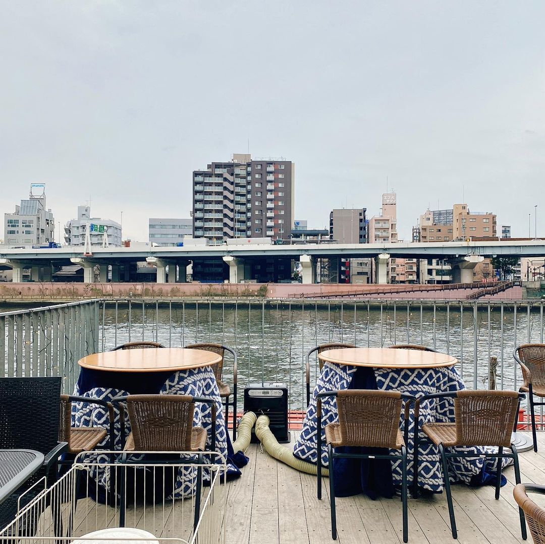 川沿いのテラスで飲む隅田川ブルーイング、格別ですね。冬の間は寒いため、テラス席のいくつかはテーブルこたつになっています。ホッカイロもサービスしてくれます。こたつつきテラスは浅草側にある和色でも取り入れていましたし、蔵前近辺隅田川沿いの定番サービスとなるかも知れませんね。