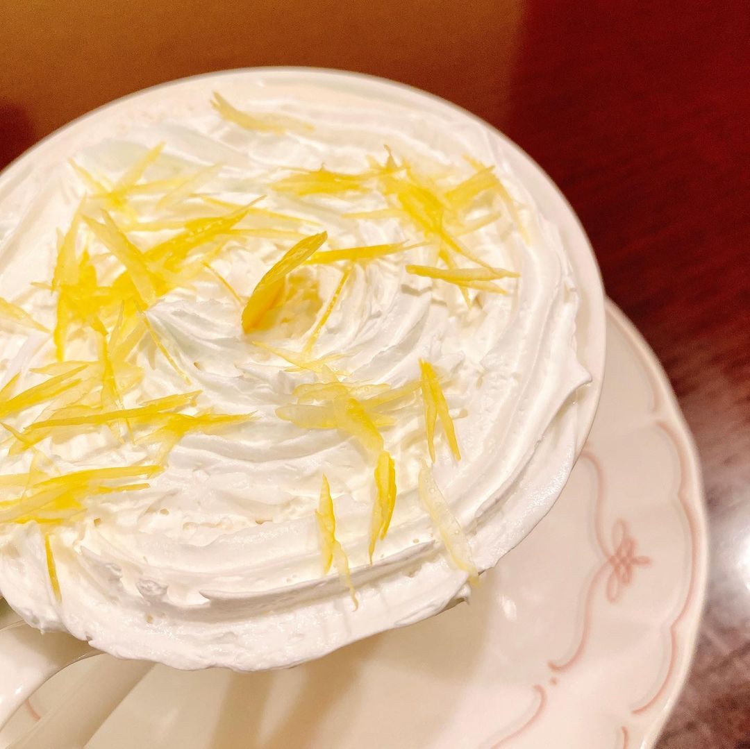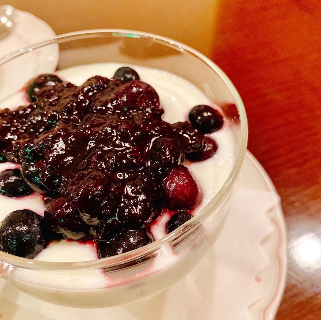 甘さを控えたヨーグルトに、冷たいブルーベリージャムとブルーベリー。ジャムも甘さはそこまで強くなく爽やかです。前回もいただいたカフェピポットはやはり香りが好きです。わかりやすく言えばウィンナーコーヒーにレモンの皮を散らしたもの、ですがこのカップ一面に満たされた盛り付けも綺麗ですよね。