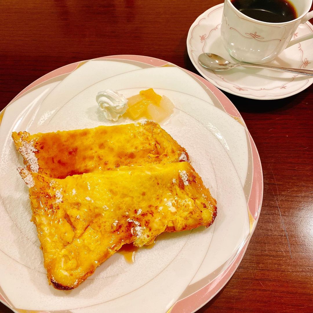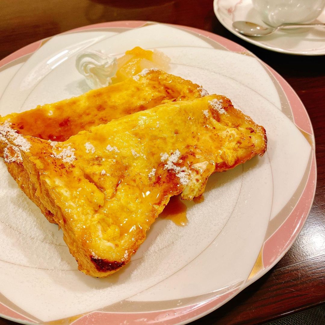 その他、モーニングAセット(フレンチトースト)も注文しました。フレンチトーストは卵液に甘みをつけずにまぶした粉糖、別添えのメープルシロップで甘みを調整する形です。