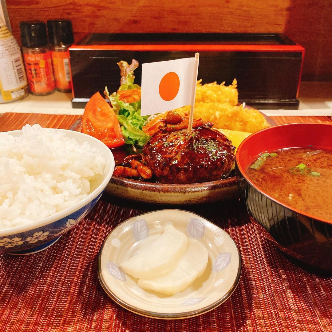 八丁味噌を使ったハンバーグのソースはこってり濃厚。ハンバーグ、エビフライ2本、サラダ、ご飯、赤だし味噌汁、漬け物です。味噌感はあるけどあくまでハンバーグソース、ご飯にも合うしビールも進みますが、今回はあえての白ワイン。見た目的にも「大人の」感マシマシです。