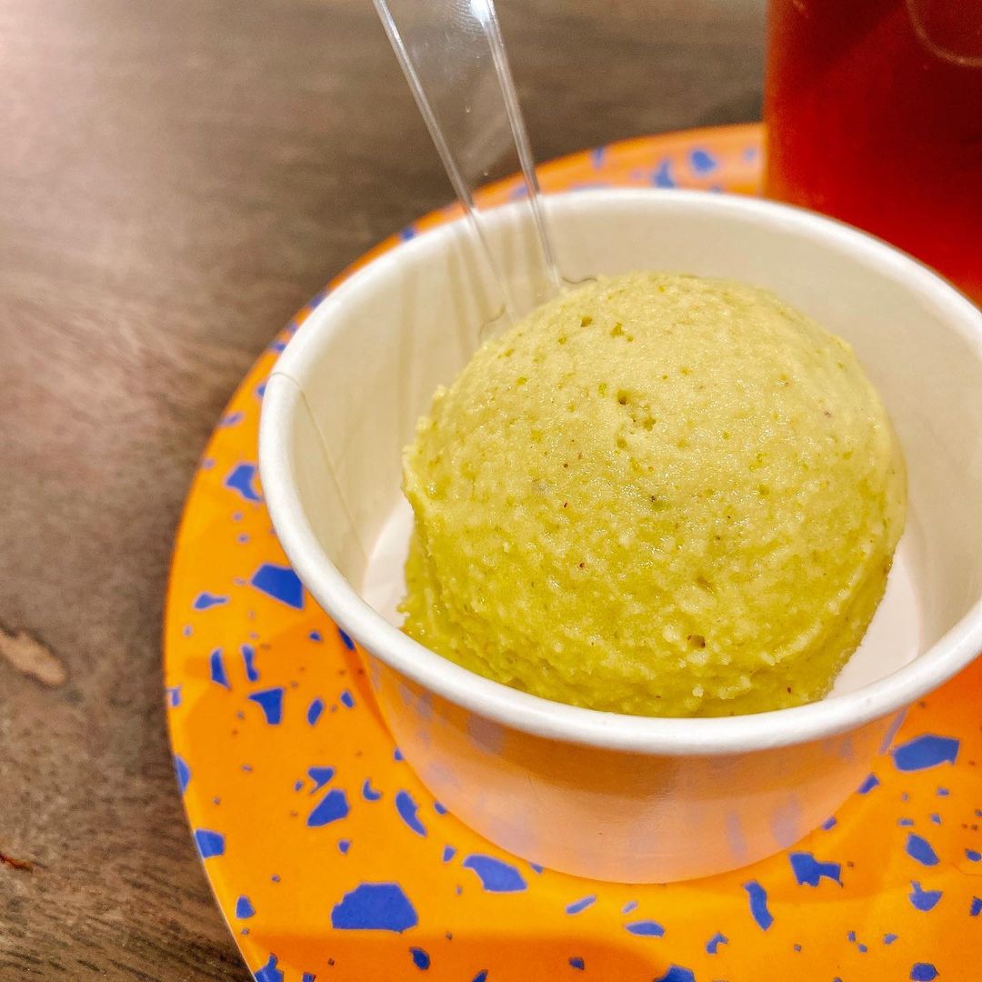 ジェラートはピスタチオの豆の風味がしっかりと感じられるタイプで、素材としてのピスタチオの風味がよく出ています。その風味とジェラートのミルキーさがホットコーヒーにまたよく合いました。