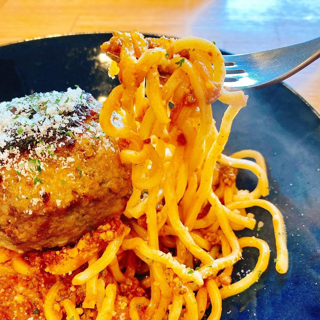 浅草開花楼の弾力のある食感の麺を使っています。乗せてあるハンバーグはそのままでもしっかり味付けがしてありますが、崩しながらトマトソースと和えてボロネーゼの一部として食べるのも良しです。