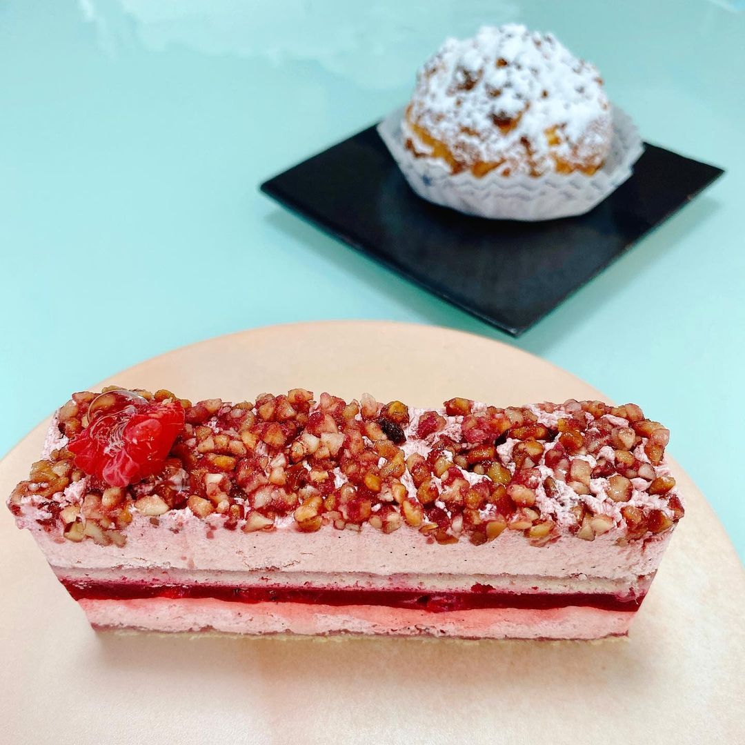 フランボワーズソースを染み込ませた生地、グロゼイユ(赤スグリ)とフランボワーズのジュレ、表面にはフランボワーズとクラックラン…と、説明にはありますが、クラックランというものを初めて知りました、サクサクした食感のクッキーのような感じですね。グロゼイユの果実の粒もプチっと良い食感。