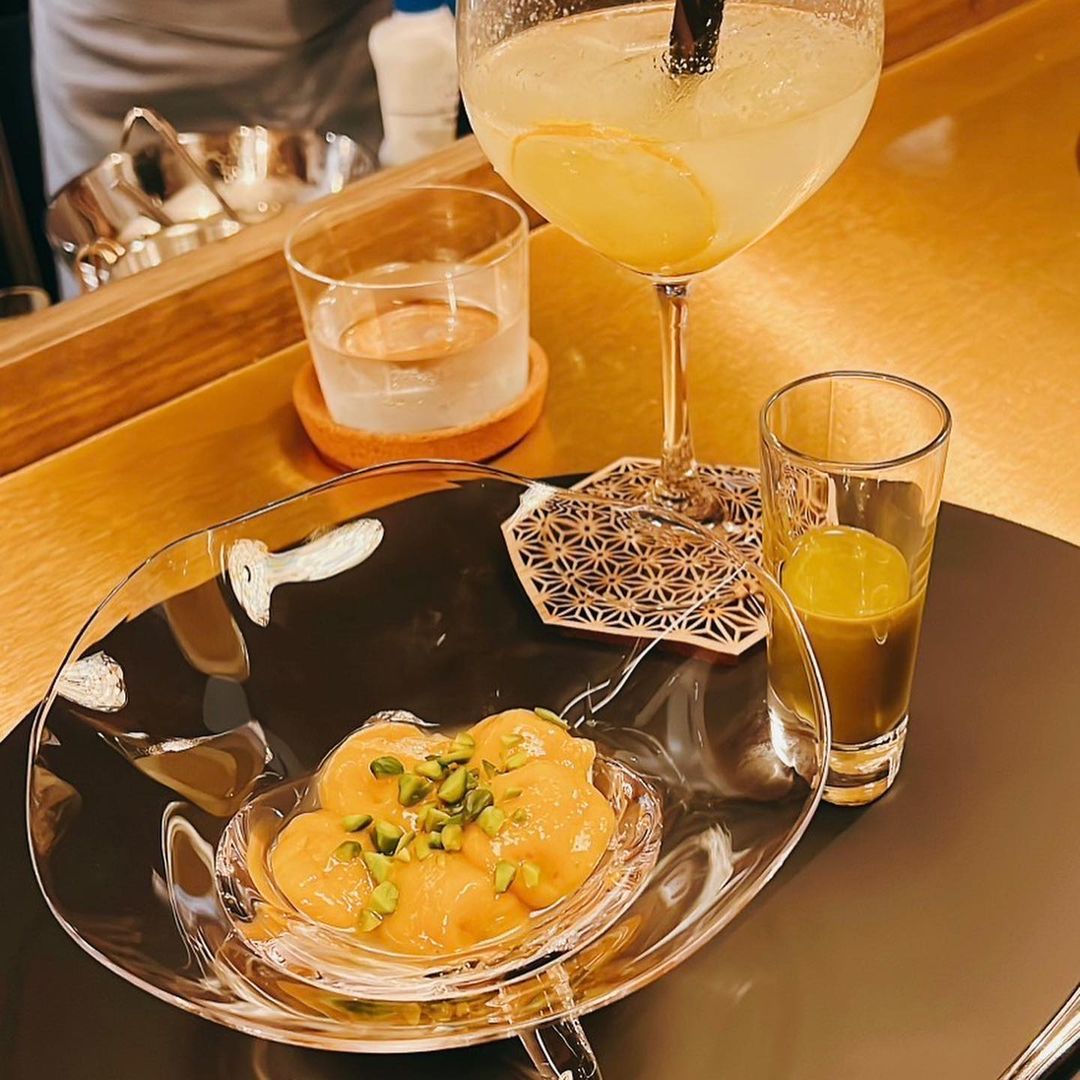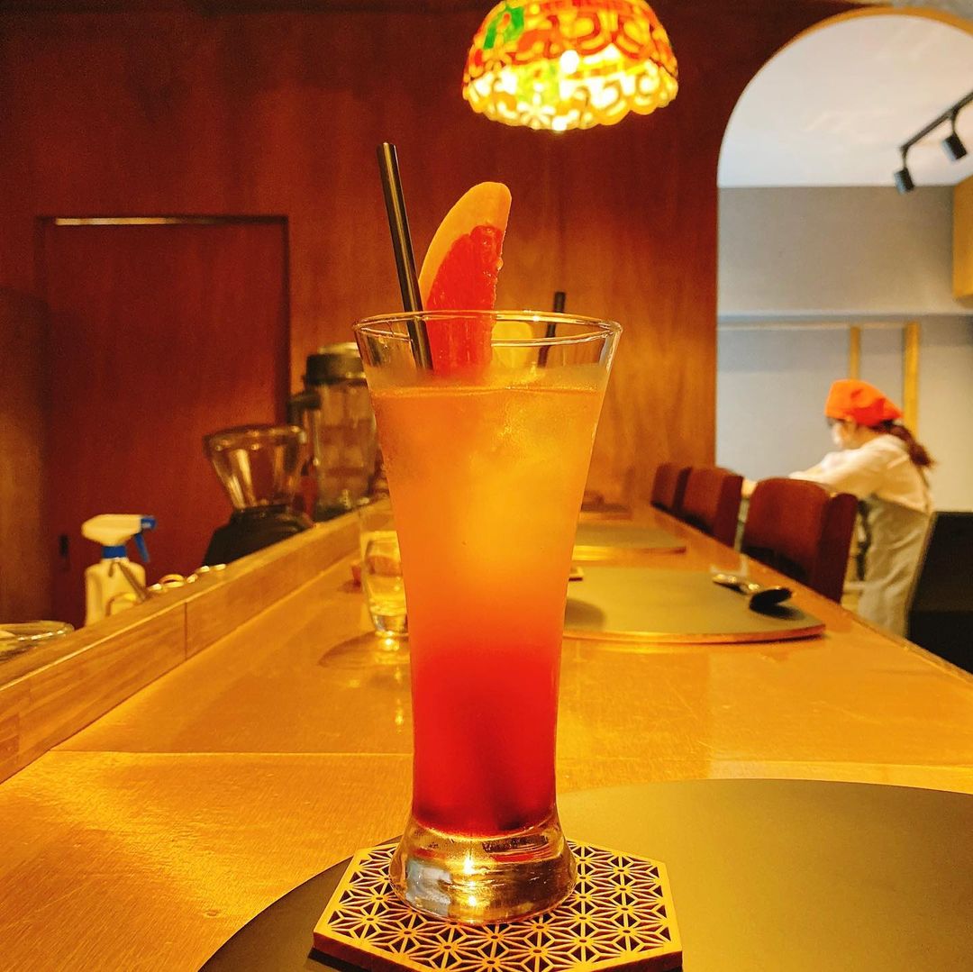パフェが提供される前にソフトドリンク、華(Hana)も注文。こちらはザクロシロップ、グレープフルーツジュース、ソーダの組み合わせ。他の方が注文していた煎(宇治抹茶、シェイクミルク、練乳シャンティー)も見た目がとても美しく、気になってしまいました。その他合わせて5種のオリジナルドリンクが用意されています。