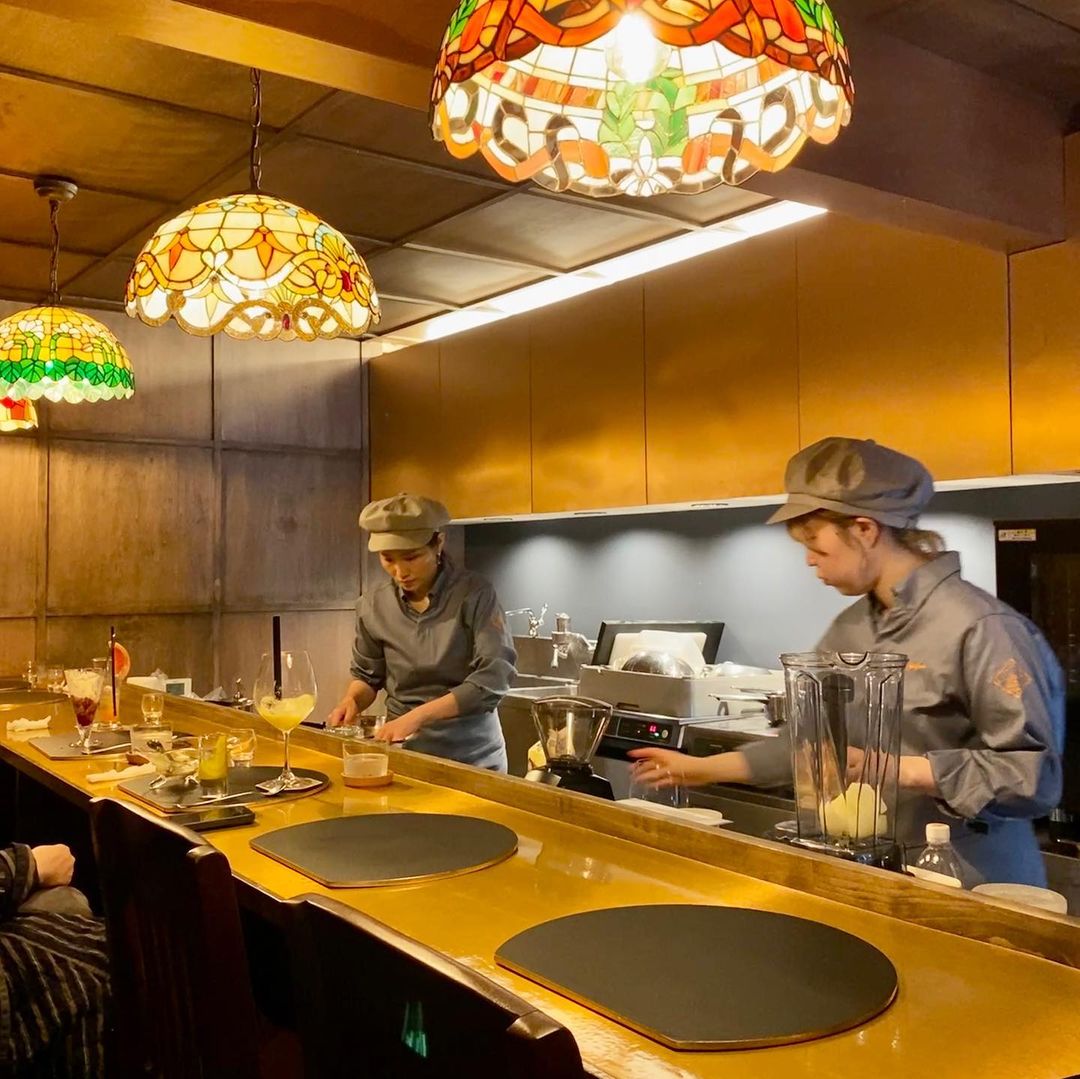 先日の投稿でも伝えたように、もともとの売り場はそのままに店の奥側を改造して、テイクアウトのケーキなどではできないことを店内のスイーツで実現するべくカフェスペースを作っていたこのお店。ステンドグラスの照明と木製のカーブが印象的な店内、7席のカウンター、わらび餅やパフェが作られていく工程もよく見えます。