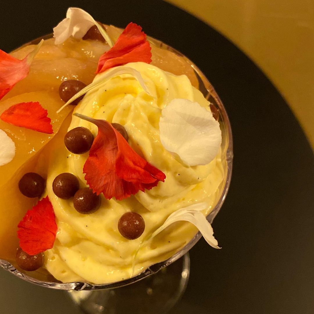 今回のイートインではこのパフェ、ジュースと別に、フルーツを使った洋風わらび餅もメインメニューとして用意されていたため、そちらも同行者とシェアしていただきました。杏など、1種類の果物の果汁のみと本わらび粉などシンプルな素材を使って作ったもので、口の中でねっとりととろけます。こちらは4種、それぞれに合わせたクランブルやソースをかけていただきます。特注のクリアな美しい皿にも注目です。