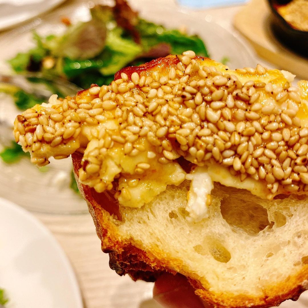 フェタチーズをゴマを振ってこんがり焼いて、ハチミツをかけたもの。フェタチーズと言えばフレッシュなものやオリーブオイル漬けで食べるイメージが強いですが、焼くと酸味が減り、しっかり香ばしく、これがまたはちみつとの相性がいいんですね。パンに乗せて一緒に食べるのもいいですし、ちびちびとおつまみにするのもいいです。主にビールと一緒にいただきました。
