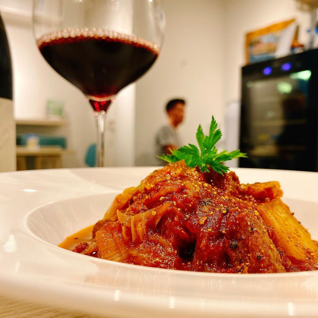 その他、グレープフルーツとフェタのグリーンサラダ、トリュフ入りグラヴィエラチーズ、ヒリノ・メ・プラサ(豚肉と長ネギのトマトソース煮)をいただきました。