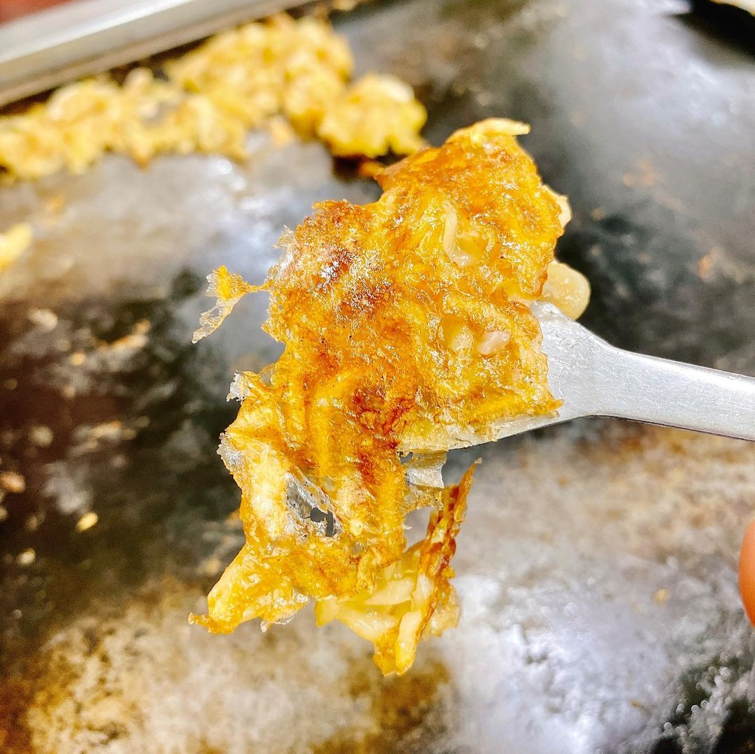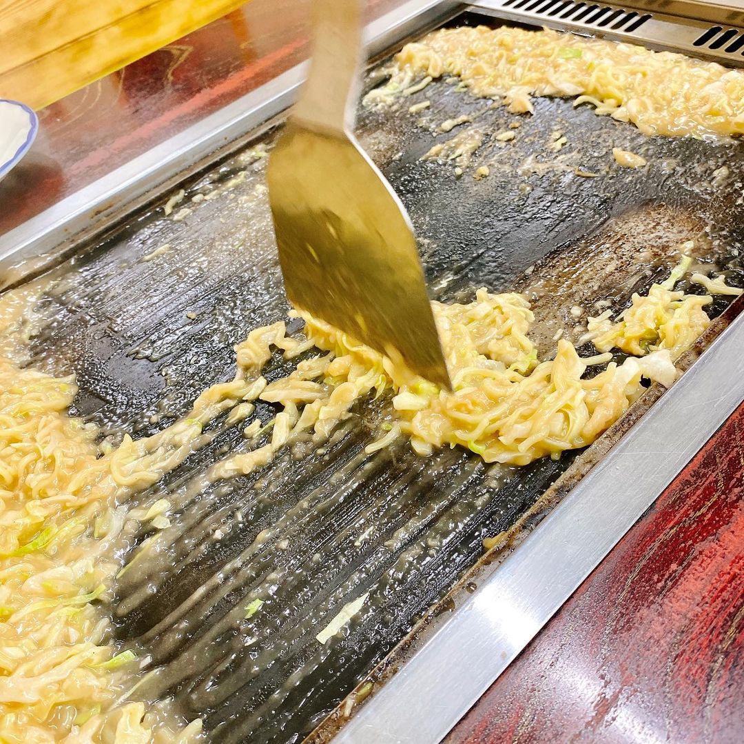 もともとこのお店に来たのはもんじゃが目当てでした。というのもここではもんじゃを店の方が作ってくれるのですが、その際コテで鉄板にもんじゃを塗って焼いて剥がす、もんじゃせんべいを作ってくれるサービスがあるからです。昔初めてこのお店で浅草のもんじゃを食べた時これを見て、もんじゃはこういうものだと思い込んでいたものでした。