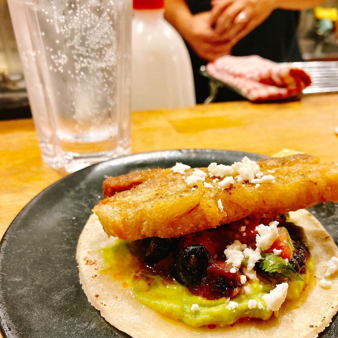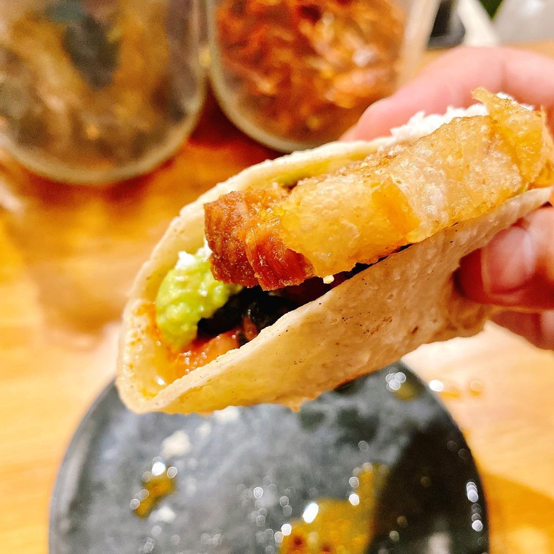 豚バラ肉はサクッとした歯ごたえでジューシーな脂身。アボカド、サルサソース、黒豆と一緒にチーズやライムを絞って口に運びますが、これが溢れんばかりの食べごたえです。タコスに乗った1品料理という感じで、肉も他の具もとてもボリューミー、惜しみないタコスです。