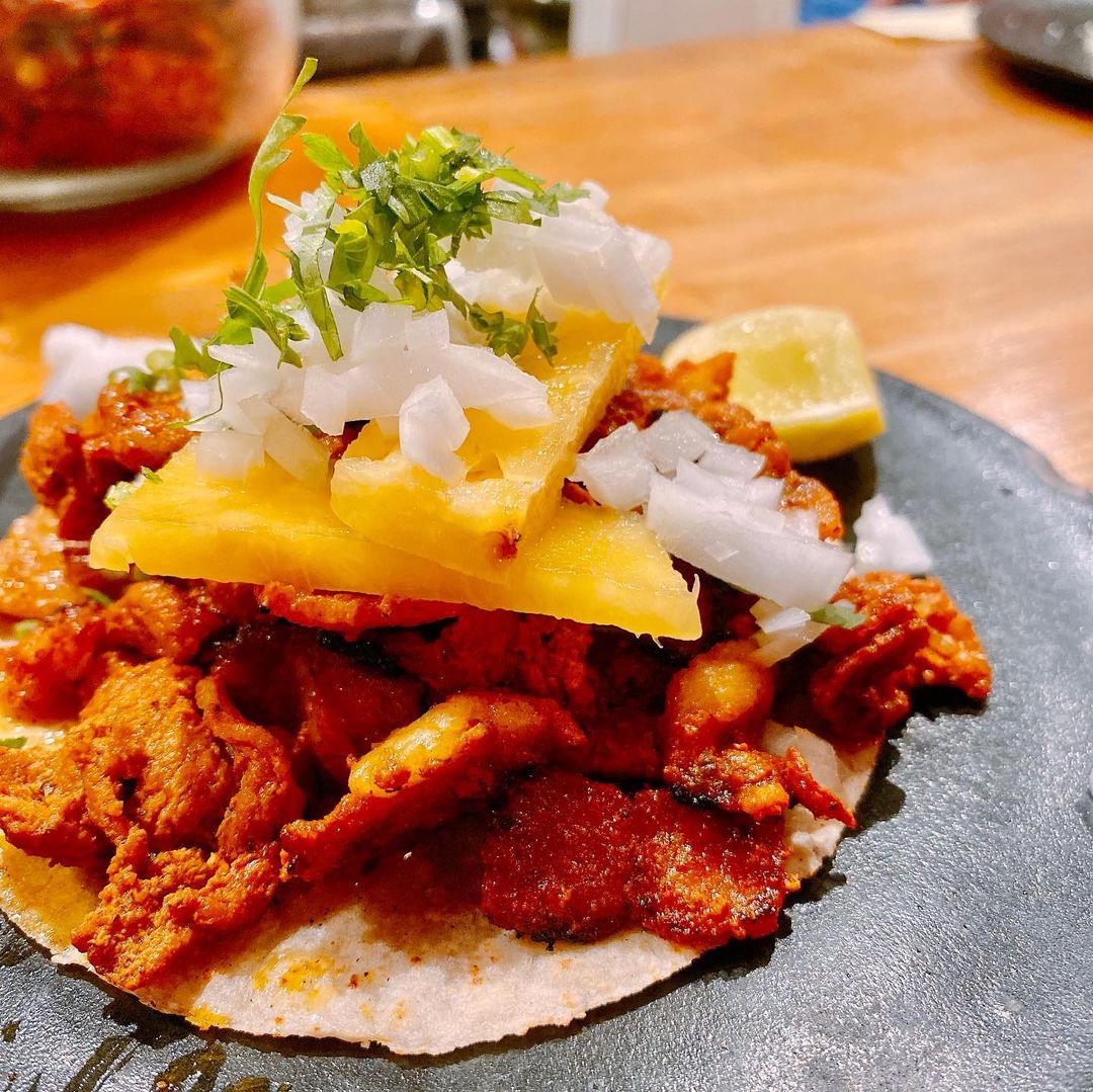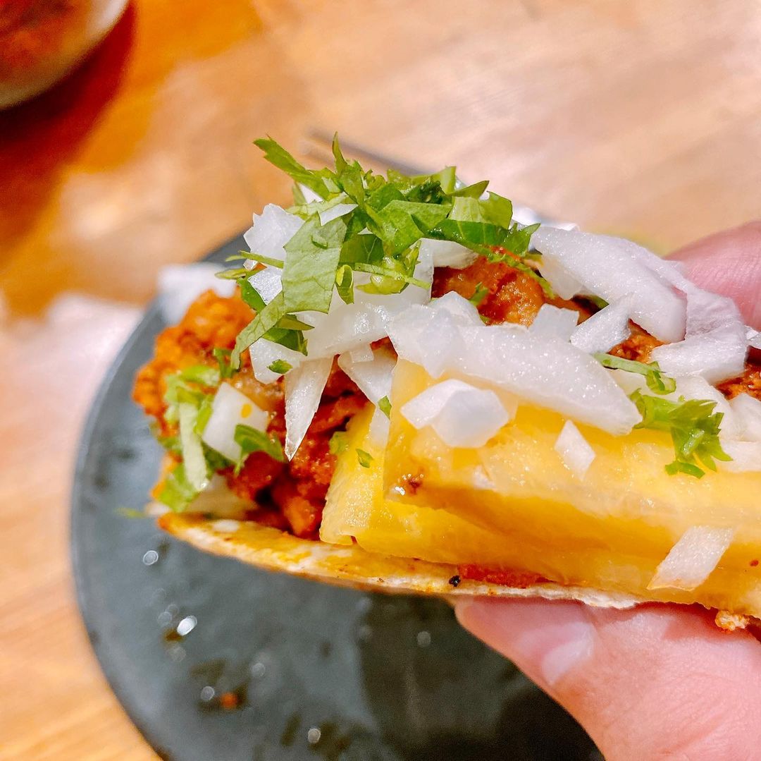 この日は軽めにと思っていたものの、弾みがついてしまいもう1つ、とポークとパイナップルのタコスも注文。こちらは豚肉の薄切りがメインのようで、更に肉モリモリ。これに加えてパイナップルや玉ねぎが乗っています。辛そうな見た目ですが、パイナップルの甘みもあってマイルド。しかし、酒はもちろん合います。