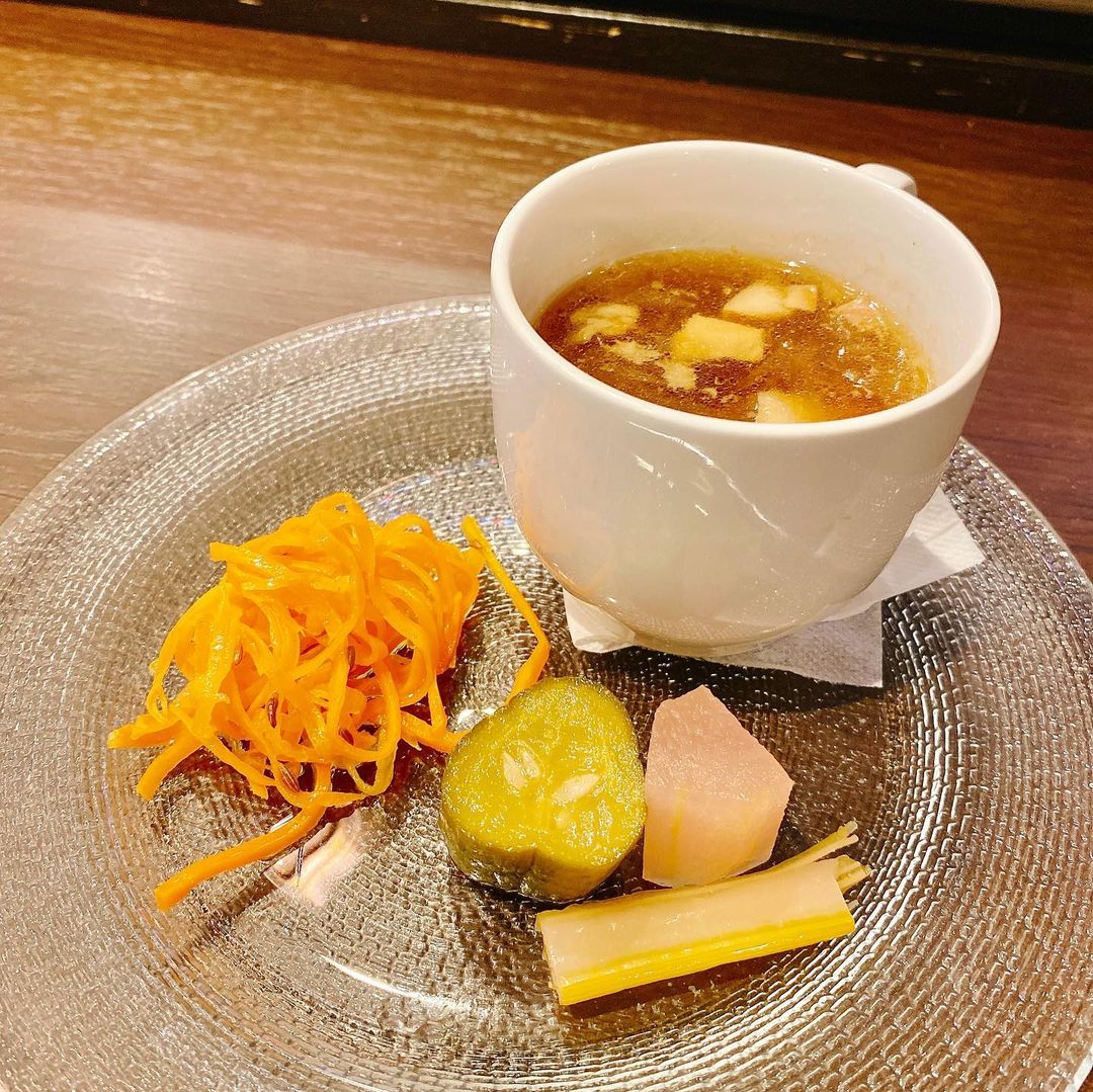 前菜にキャロットラペ、ピクルス、豚汁がつきます。店主はそもそも酸味のある食べ物が好きだということで、そのためか付け合わせも酸味のあるものが並んでいますが、豚汁は酸味系ではなく、濃く塩味の強いコンソメスープのようなもので、ご飯に対する味噌汁のようにちょうどよく感じました。