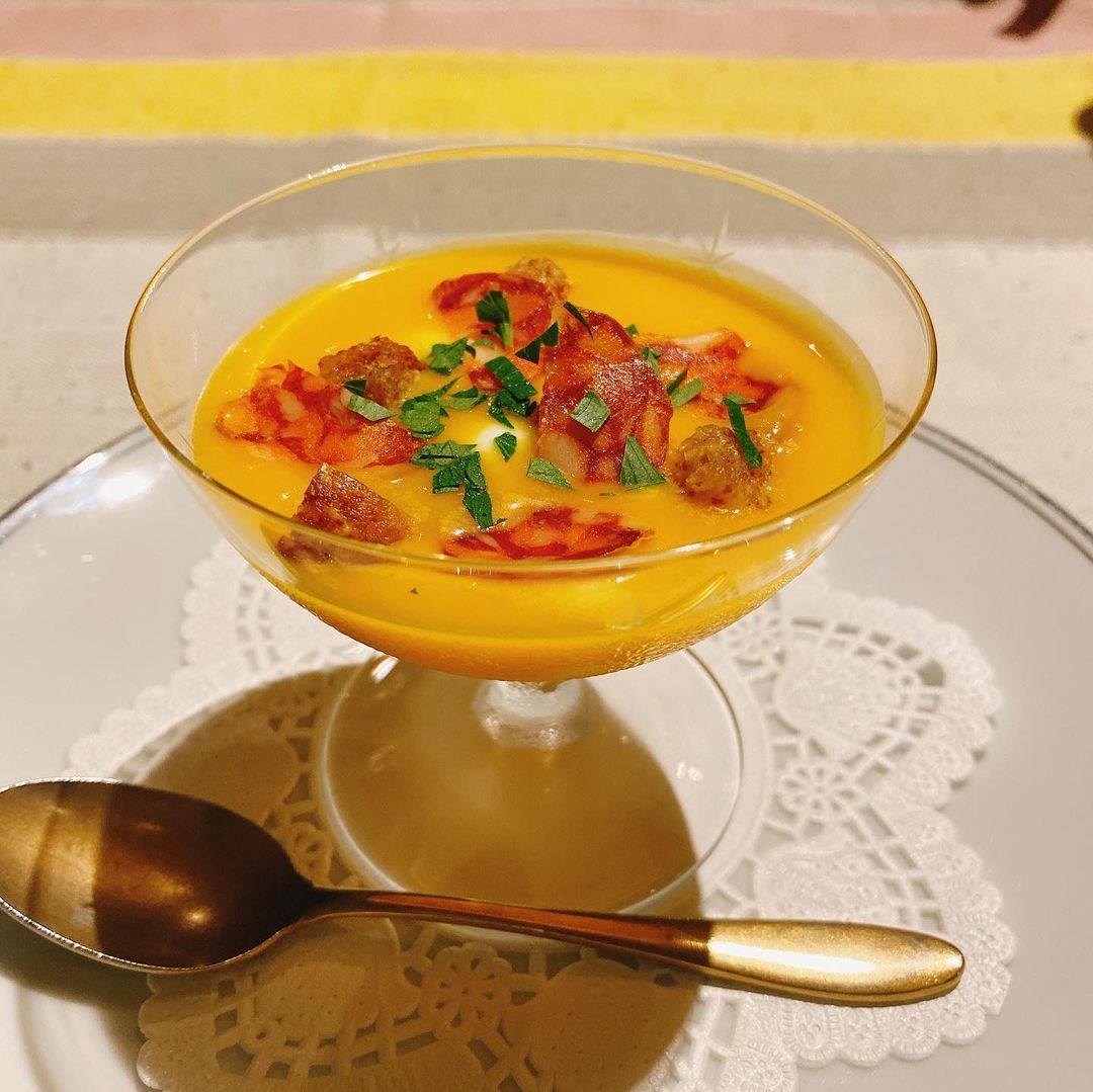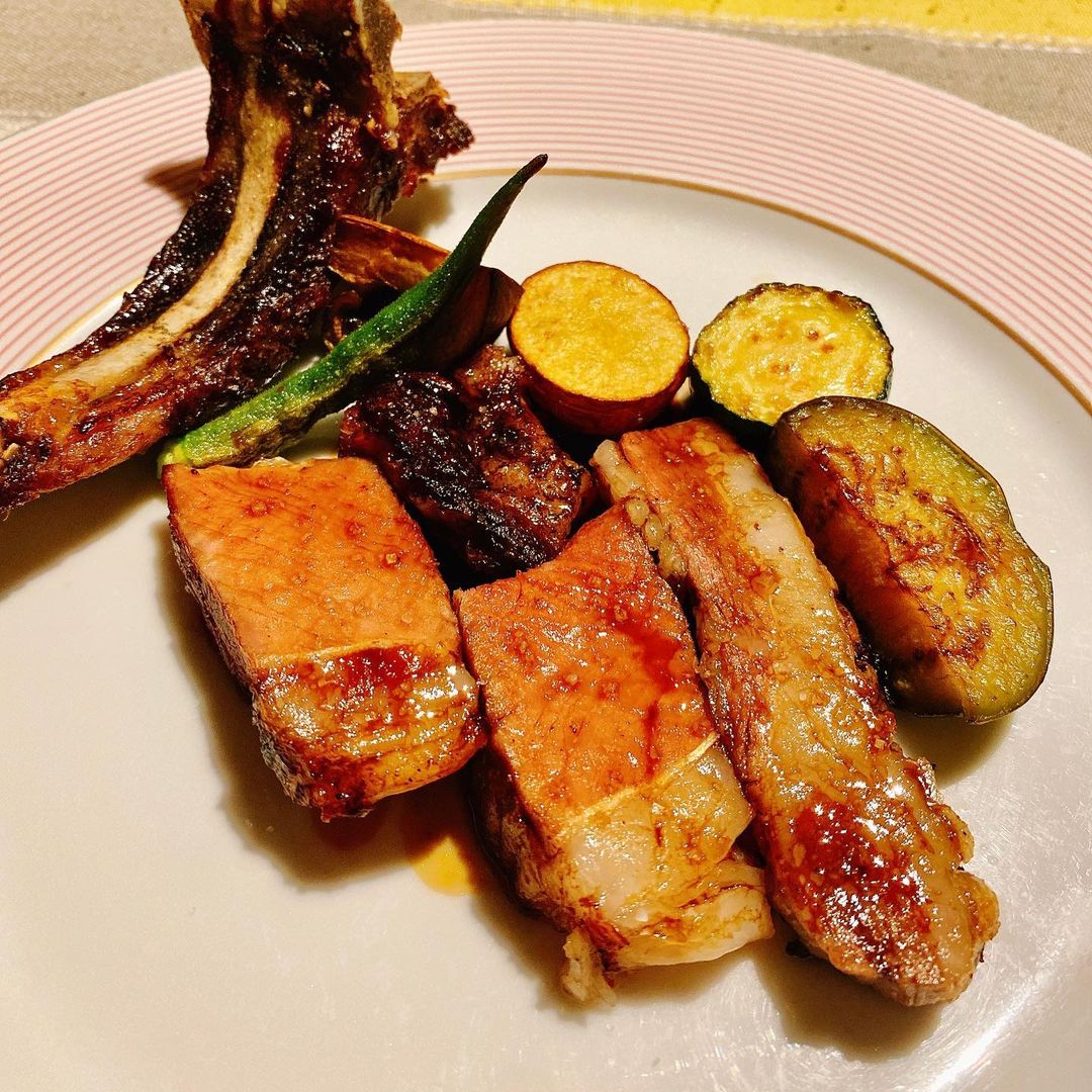 純血マンガリッツァ豚のコース。サラミを浮かべたかぼちゃの冷製スープから始まり、シャルキュトリー、そしてメインの純血マンガリッツァ豚のローストと続きます。ローストは写真骨付きリブロース肉の左手前の2つがロース芯、右側がカブリ、黒くて丸い部位がバラ肉側の肉。カブリというのはロース肉にかぶさってついている部位とのことで、脂身の旨みもしっかりしていて1番好みでした。