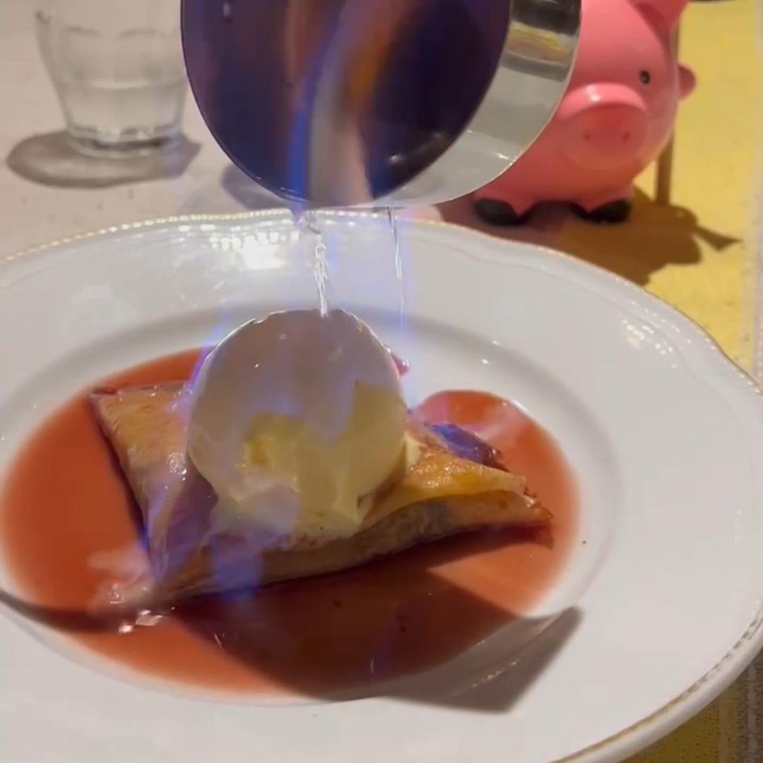 デザートはマスカルポーネのアイスとイチジクのクレープとコーヒーを。アイスには火をつけたコアントローが注がれます。赤ワインのソースやコアントローのオレンジの香りがアイスとクレープの風味を高めます。デザートにまで手が込んでいて、楽しませてくれます。コースはそこまで量が多いわけでもないですし、デザートまで楽しむのがマストだと思います。