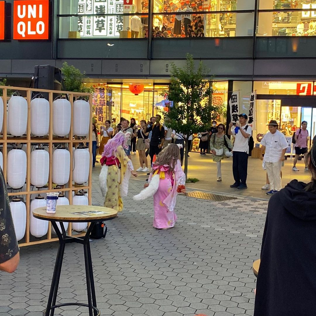 この日はたまたま時間が空いたため、そろそろ外で飲みたいなと立ち寄りました。この六区ブロードウェイでは https://www.instagram.com/omatsurirokku の浅草夜祭というイベントが毎週の日祝前日行われています。少なくとも土曜の夜にはこうしてキューブ型の提灯が設置され、夜にはステージとなります。ステージ上や周囲に毎週違った団体が出演し、踊りや音楽をつかった演出を行います。こうしたイベントを楽しむのは主には観光客かもしれませんが、近隣住民も楽しめる場です。