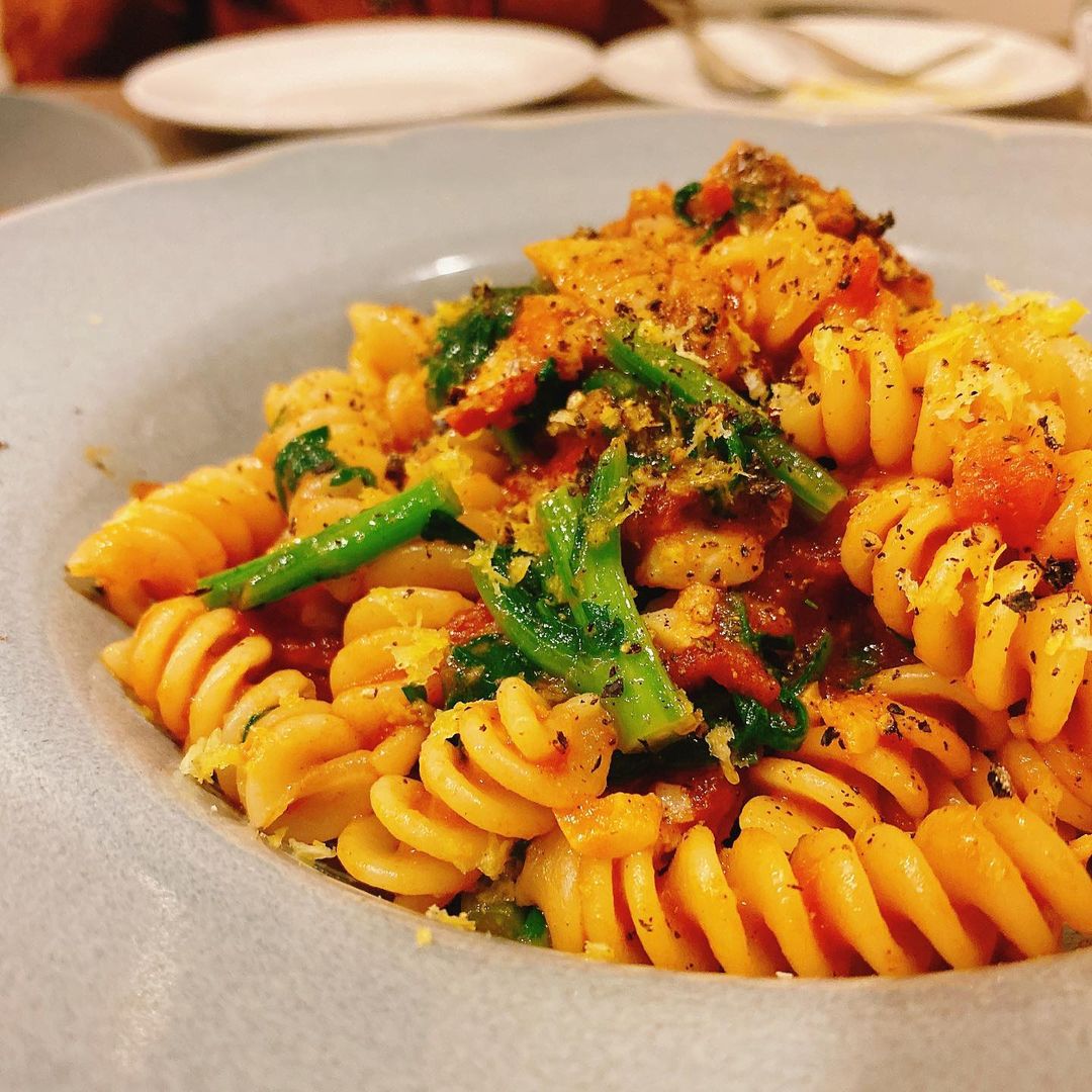 今回は軽めの食事だったのでメインは食べず、〆のパスタはサンマとトマトのフジッリ、青菜はつるむらさきかな。残りのワインをちびちびと楽しみながらおつまみ的にいただきました。