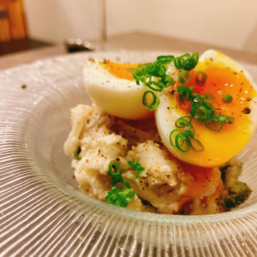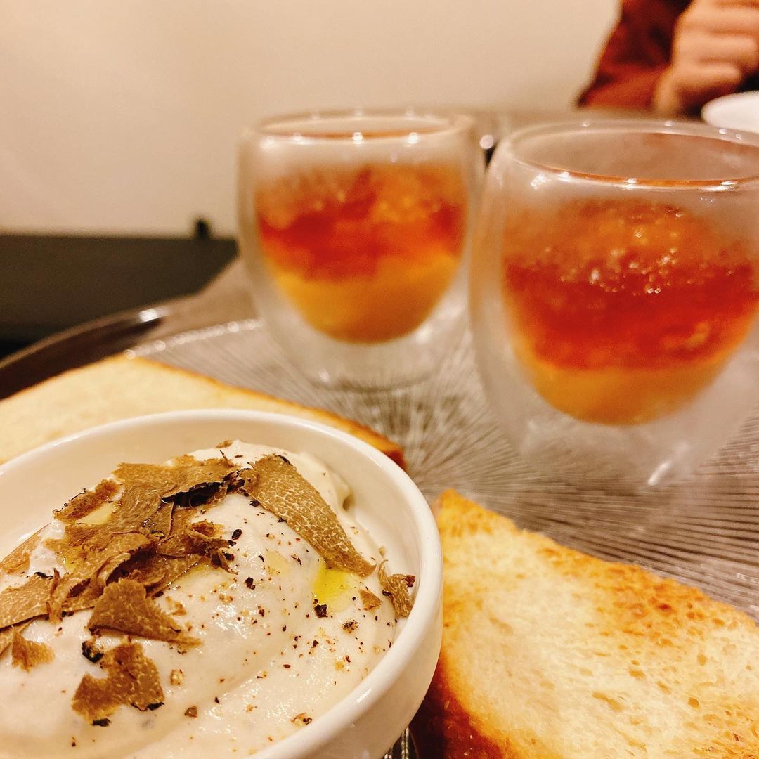 他に自家製ボイルハム入りポテトサラダ、そして名物メニューらしい修行時代の思い出 人参ムースコンソメジュレ 赤海老添えをハーフサイズで。こちらは以前イベント、酔いの宵でも提供されていたもので、また食べたくて注文。ムースのまろやかさ、ジュレと赤海老の旨み、これを程よく酸味と甘みのあるプロセッコと一緒に楽しむのがまた最高でした。ジャガイモのムース トリュフ風味とも迷っていたら、ハーフにしていただけました。