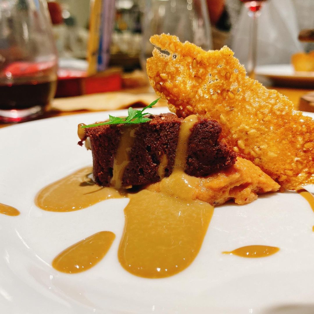 石焼の器に盛られた米に残ったスープをかけてチーズを削りかけ、リゾット風に。〆はテリーヌ・ド・ショコラ 〜ソース・オ・キャフェ〜 をいただきました。チョコのテリーヌにりんごのコンフィチュールが添えられていて、最後まで濃厚なコースが楽しめました。