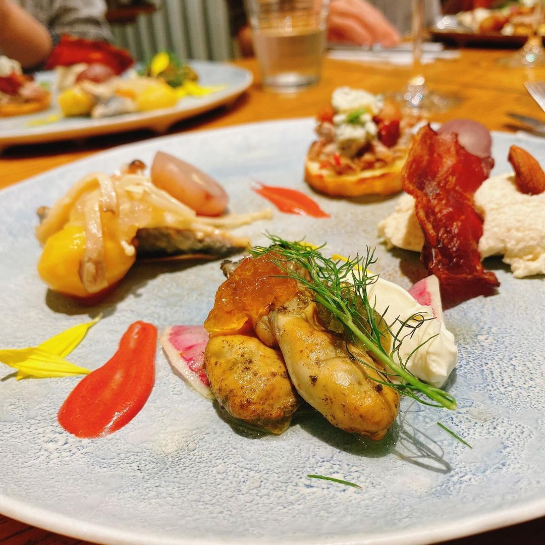 コースはまず前菜の盛り合わせ。秋刀魚と栗のエスカベッシュ、焼き林檎 ブルーチーズ 塩豚のタルティーヌ セロリラブのムース仕立て ベーコンのチュイルとアーモンドのアクセント、牡蠣のスモーク あおさジュレとレモンのコンフィチュールを添え…と、フレンチらしい情報量のメニューが盛られます。フレンチをベースとしたラーメン屋というコンセプトのようで、ソースにもこだわった料理の数々。