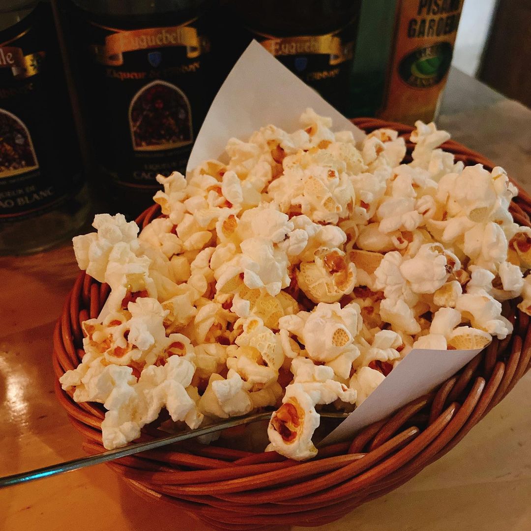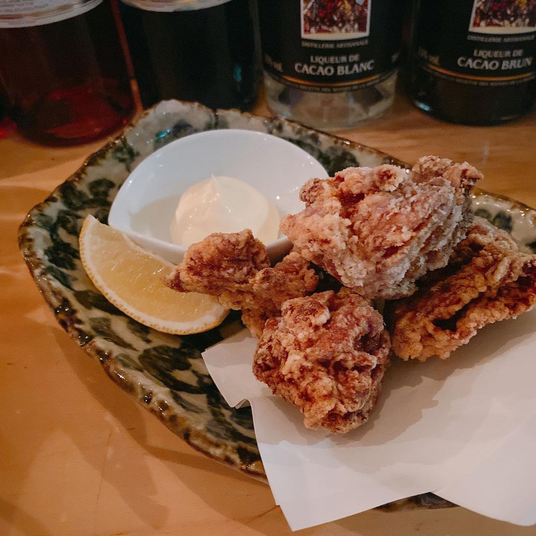 お通しはポップコーン。無限に出てきます。そして唐揚げ。初めて食べたとき、なんか、ふるさとの味がする!どういう味付けなんですか?と店長に聞いたら、これは生姜を下味にしっかりつけた九州風の味付けだそうで、納得しました(自分が九州の出身なので)。