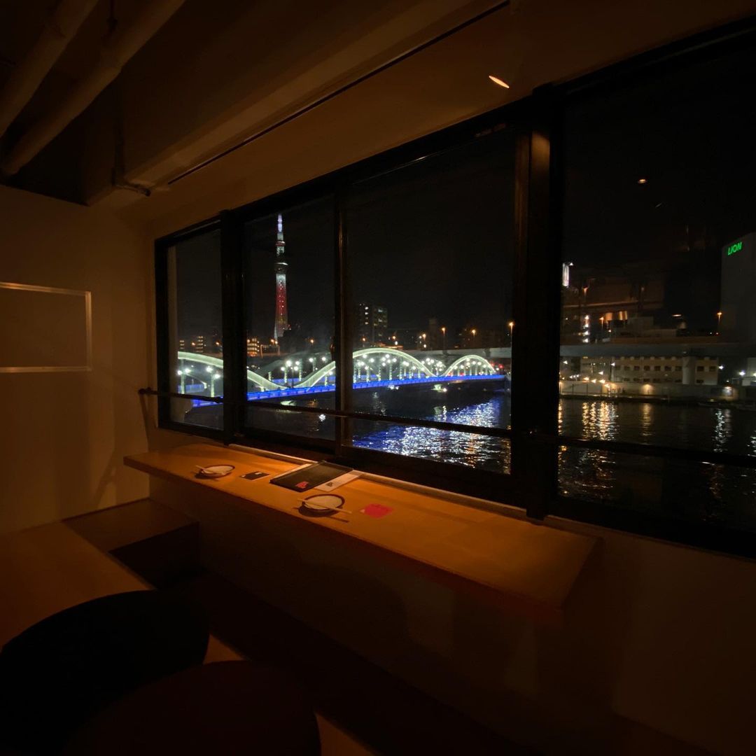今晩座ったのはカウンター、もちろんカウンターはバーを楽しむのにもっとも適した席だと思うんですが、お店のメインは床座りのダイニング的な席。厚めのクッションに座って、隅田川側の全面窓から川やスカイツリーを眺めながらお酒が飲めます。1席だけ川側の窓を正面にして座れるカップル席みたいな席もあります。ぜひ予約ではこの席を指定してみてください。