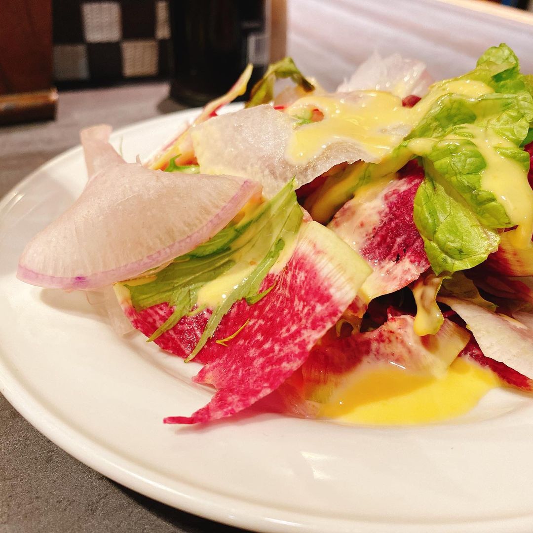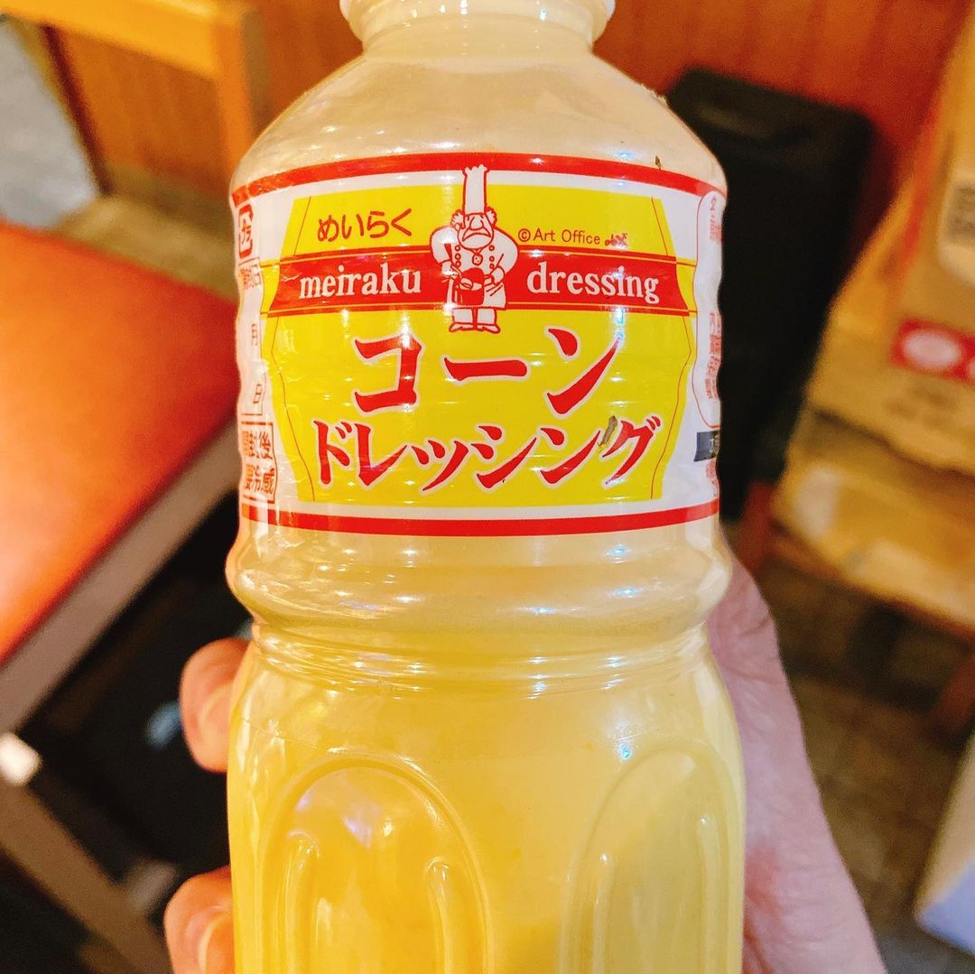 前菜のサラダにかかっているコーン風味のドレッシングが好みだったのでどこのメーカーかと質問したら、「めいらくのコーンドレッシング」だと教えてもらえました。これ絶対家にも欲しい(その後買いました)。