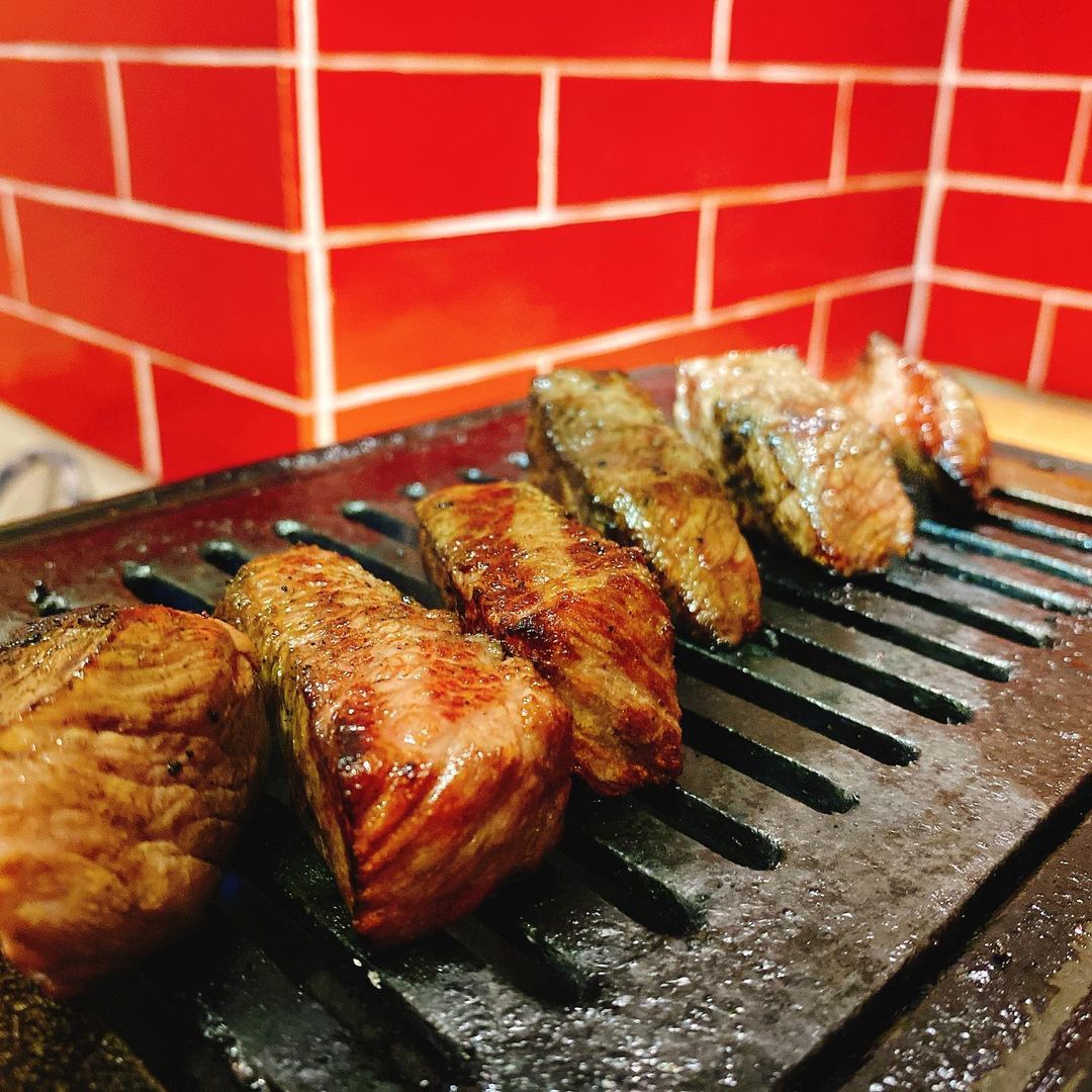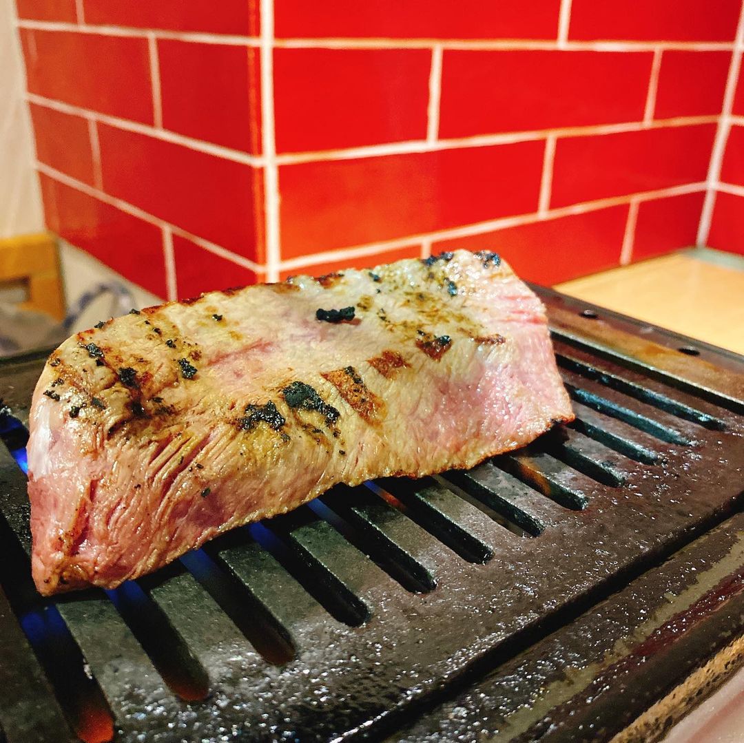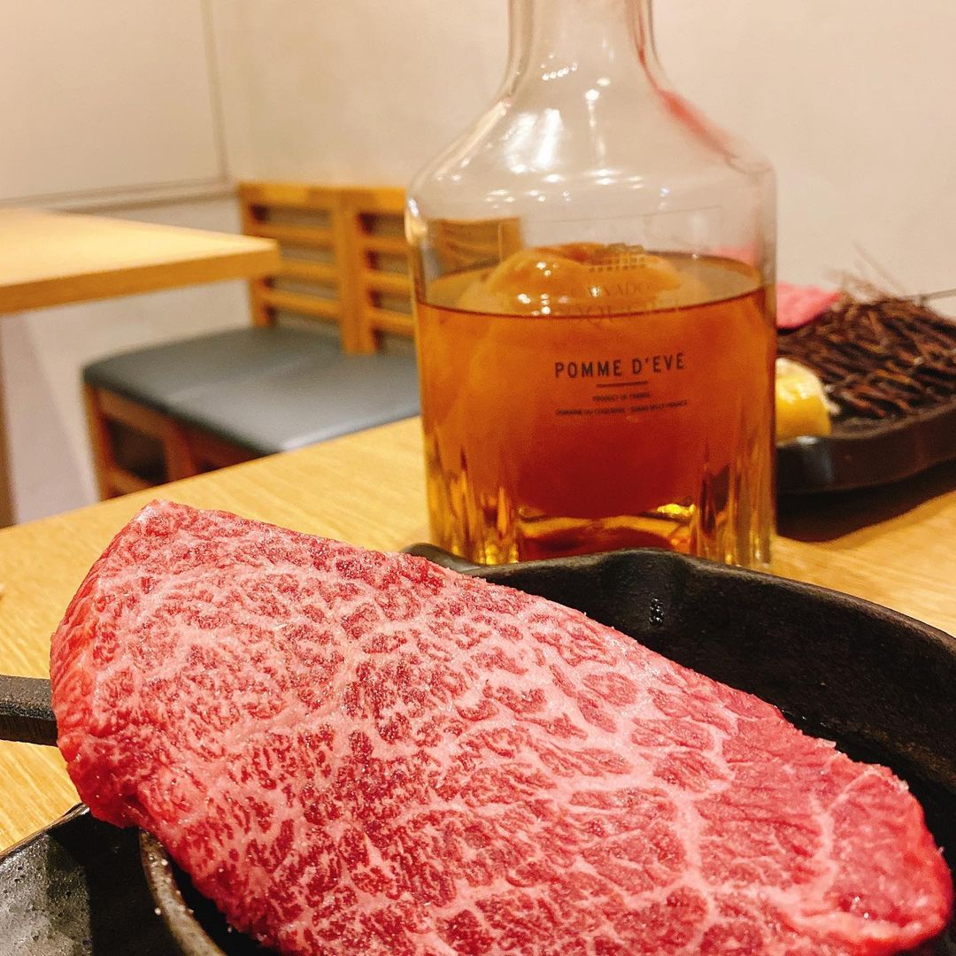分厚い肉を、りんごを丸ごとつけたカルヴァドスで目の前でフランベしてくれるのがこのお店の名物。リブマキステーキ、ロース、ハラミなどの厚切り肉のどれかを選んで焼いてもらいます。たまに他の希少部位が出てくることもあり。