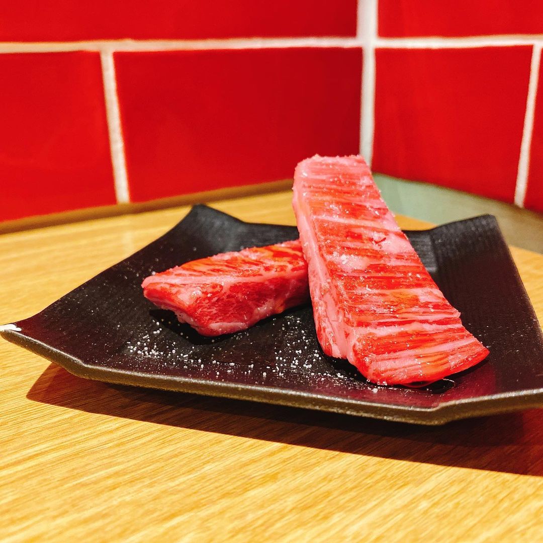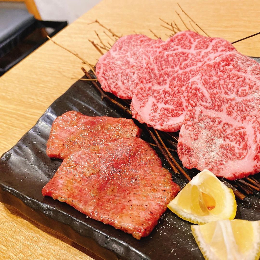 このお店はお肉一枚売りの焼肉店。カルビ、ロース、ハラミなど、定番の焼肉を1人前ではなく1枚ずつ頼めます。ここ数年でこのスタイルも増えましたよね。今回は上タン、上カルビ、中落ちカルビなどを頼みました。