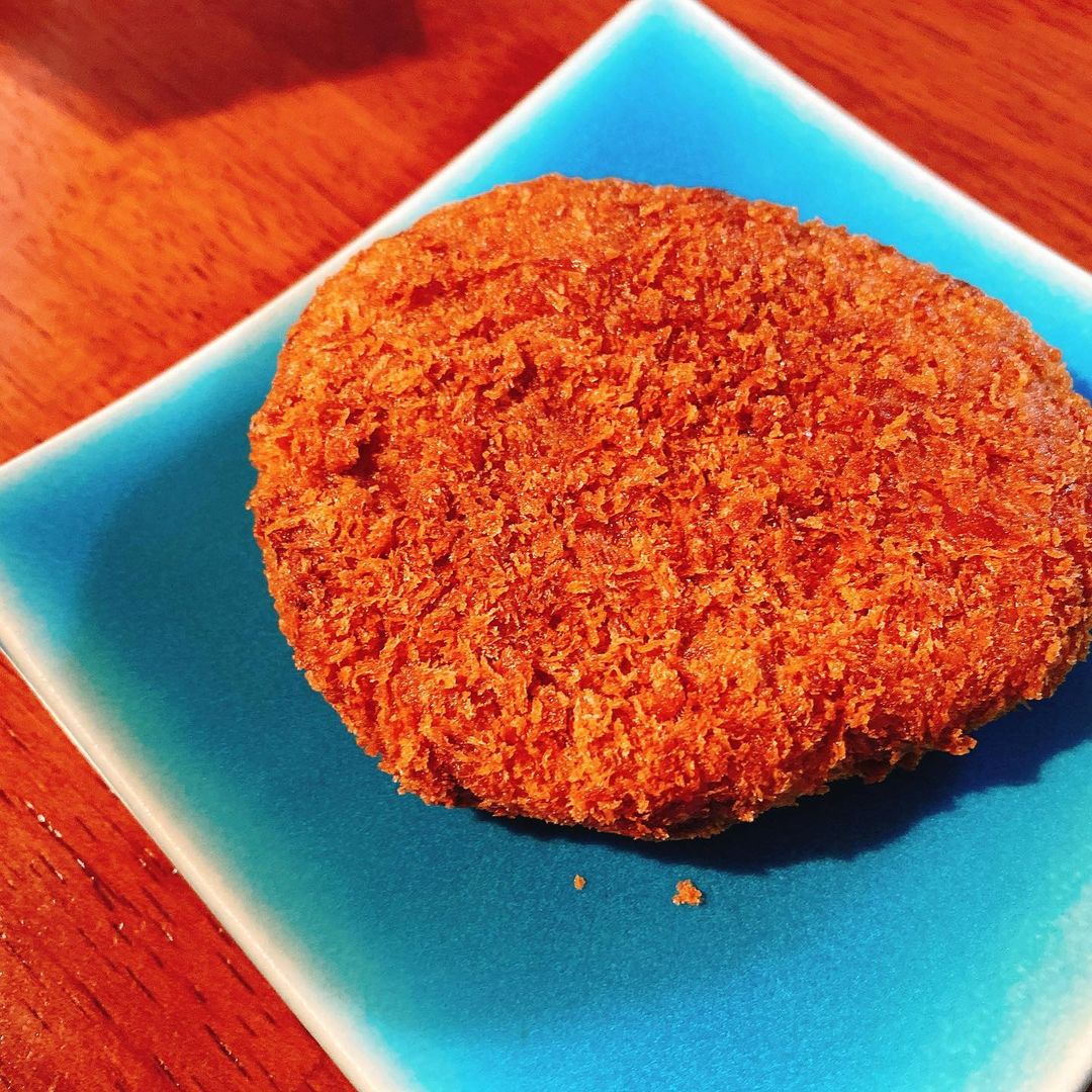一緒に厚焼き玉子も購入。この投稿はGurutaiぶらりやなか銀座、食べ物編です(今決めました)。というわけで別のお店の写真も一緒に載せます。肉のサトーの手作り和牛入り谷中メンチ。がちっとした衣をサクッと割ると肉肉しい香りがフワッと。