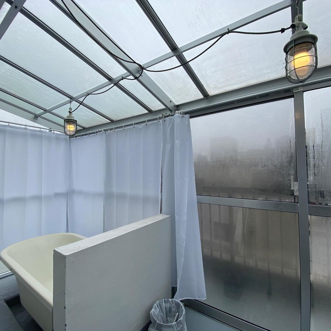 部屋は7つ、マックス21人の小さなホテルです。屋上あり4階建てのビルの2〜4階が客室、屋上はテラス風呂です。夜はスカイツリーのライトアップが見えていいそうですが、朝のお風呂も清々しくて良かったです。天窓が開く仕掛けも。