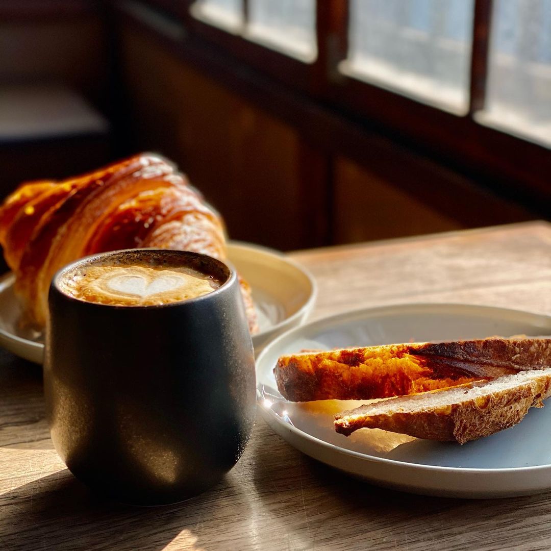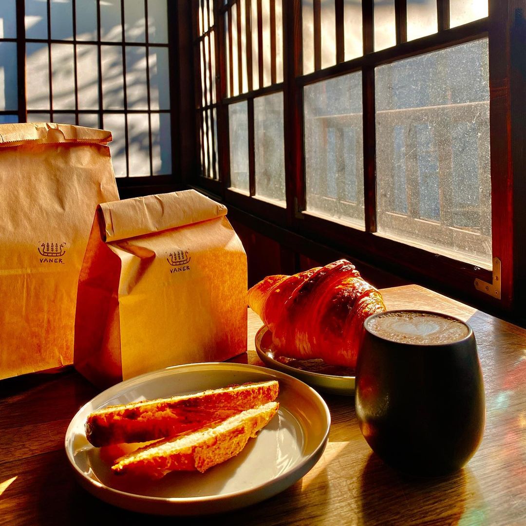 日暮里のパン屋、Vanerのサワードウブレッド、クロワッサン、カフェラテ。サワードウブレッドはこのお店のメインらしく、それとクロワッサンが大好きなので、カフェラテと一緒に。
