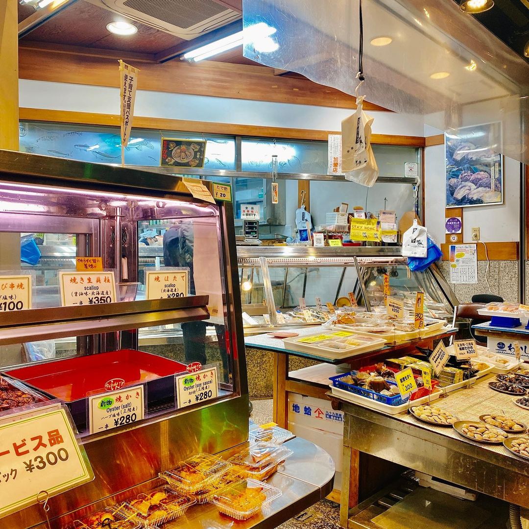 日暮里の魚屋、福島商店の焼き牡蠣串(醤油タレ)とホタテ串