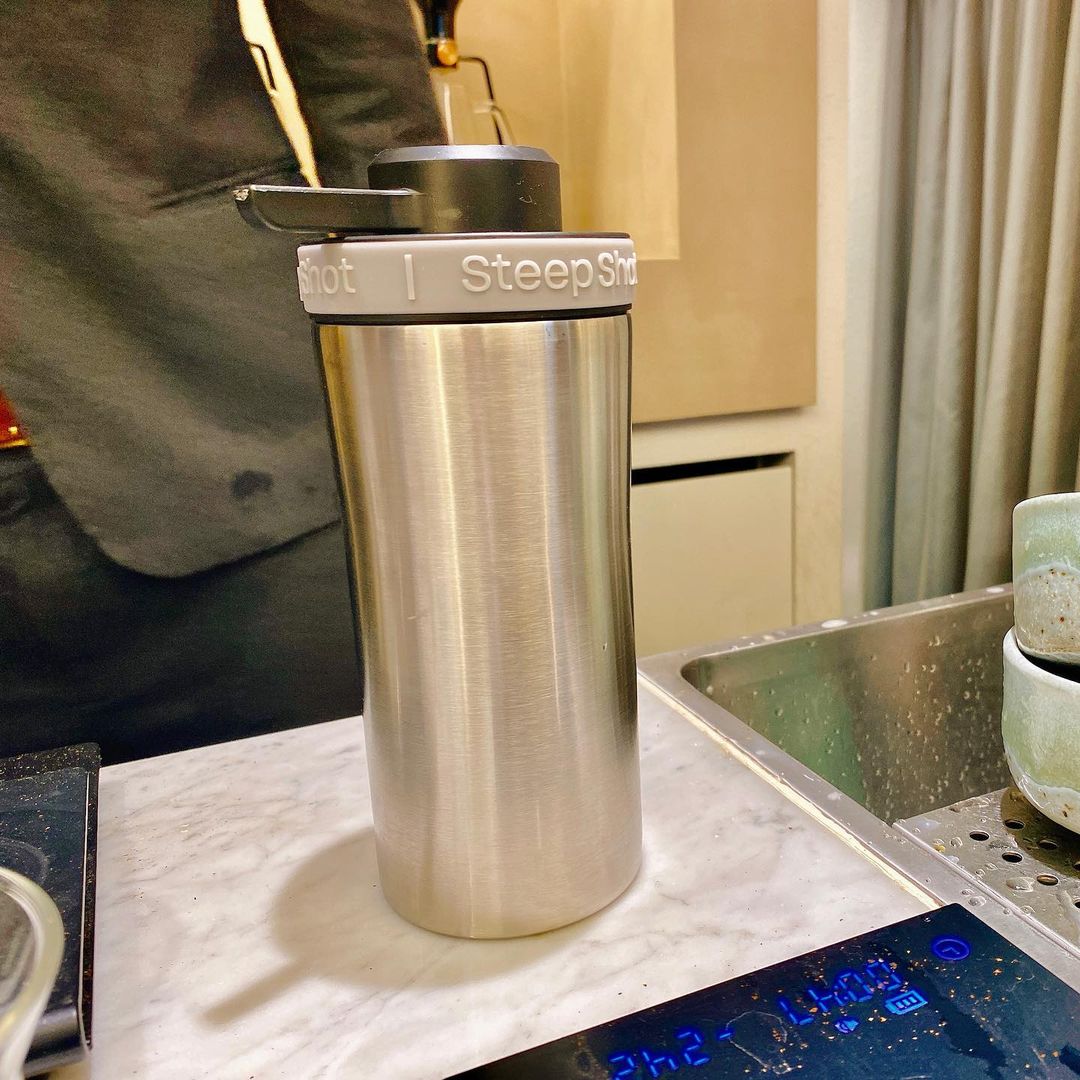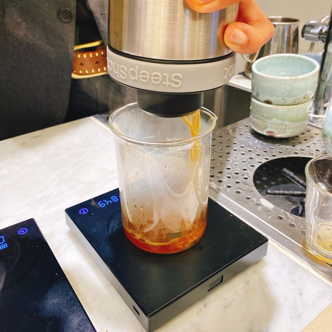 そして前回も頼んだフィルターコーヒー(Nicaragua Ortez el Bosque)を今回も。今度は最近導入したとInstagramで言っていたSteepshotという器具を使って同じ豆のコーヒーを淹れていただきました。粉砕した豆とお湯を入れ、蓋をします。