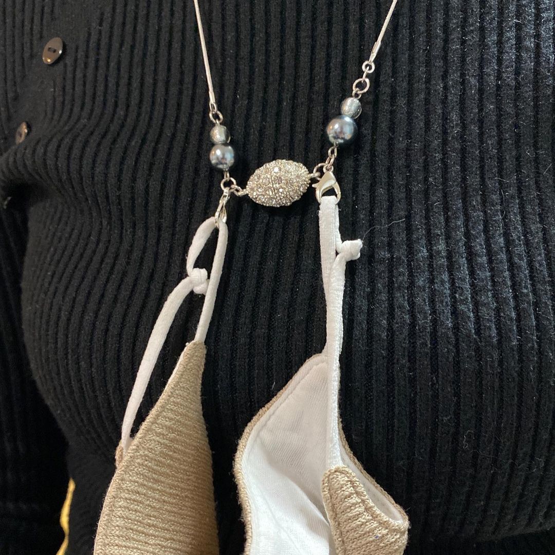 プレゼント用に買いに行きました。チェーンの先にマスクの紐を挟み、首からぶら下げることができるアクセサリーです。最近よく見かけるようになりましたよね。