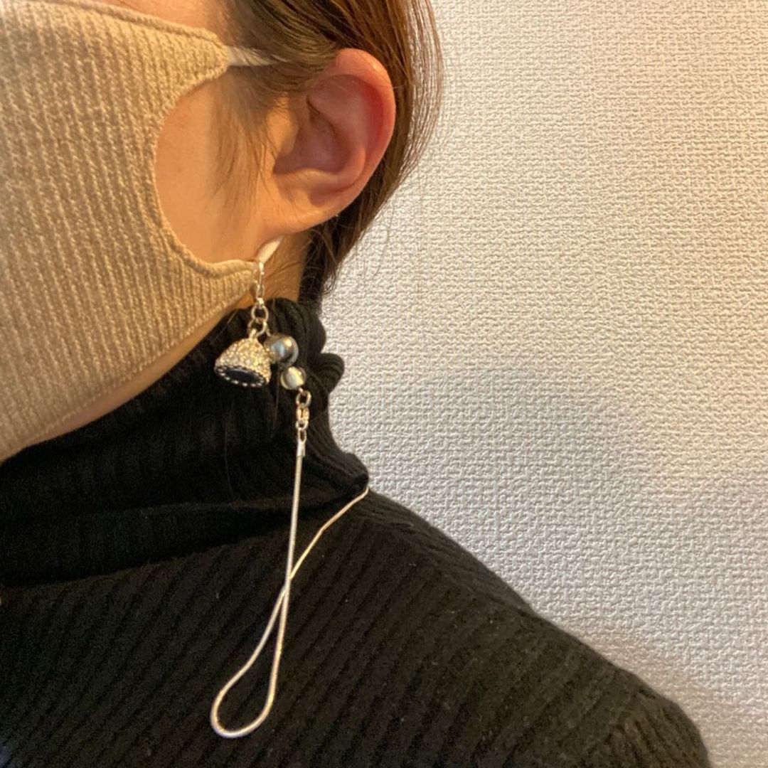 マスクに取り付ける金具はチャームのような磁石がついていて、それでマスクを閉じることができるようになっていて、マスクを着用している時はイヤリングのようになります。機能性と見た目を両立してますね。