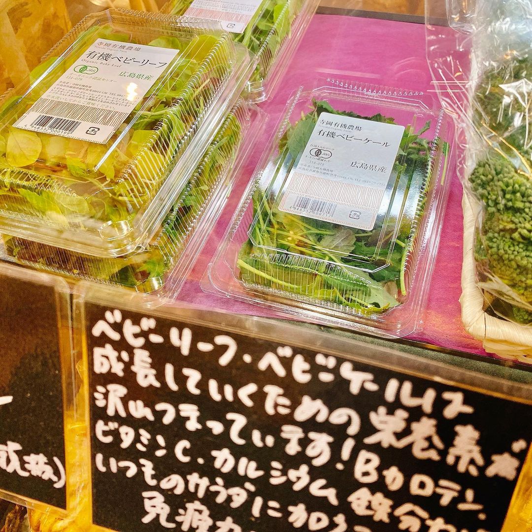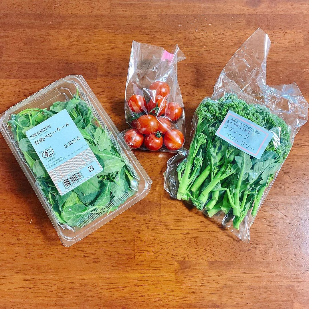 ベビーケールは寺岡有機農場、広島。スティックブロッコリーは吉田さんちのこだわり野菜、奈良。キャロルクミニトマトは和歌山。真ん中に乗ってるベーコンはオークハウス、神奈川。ベーコンだけ通販で購入。